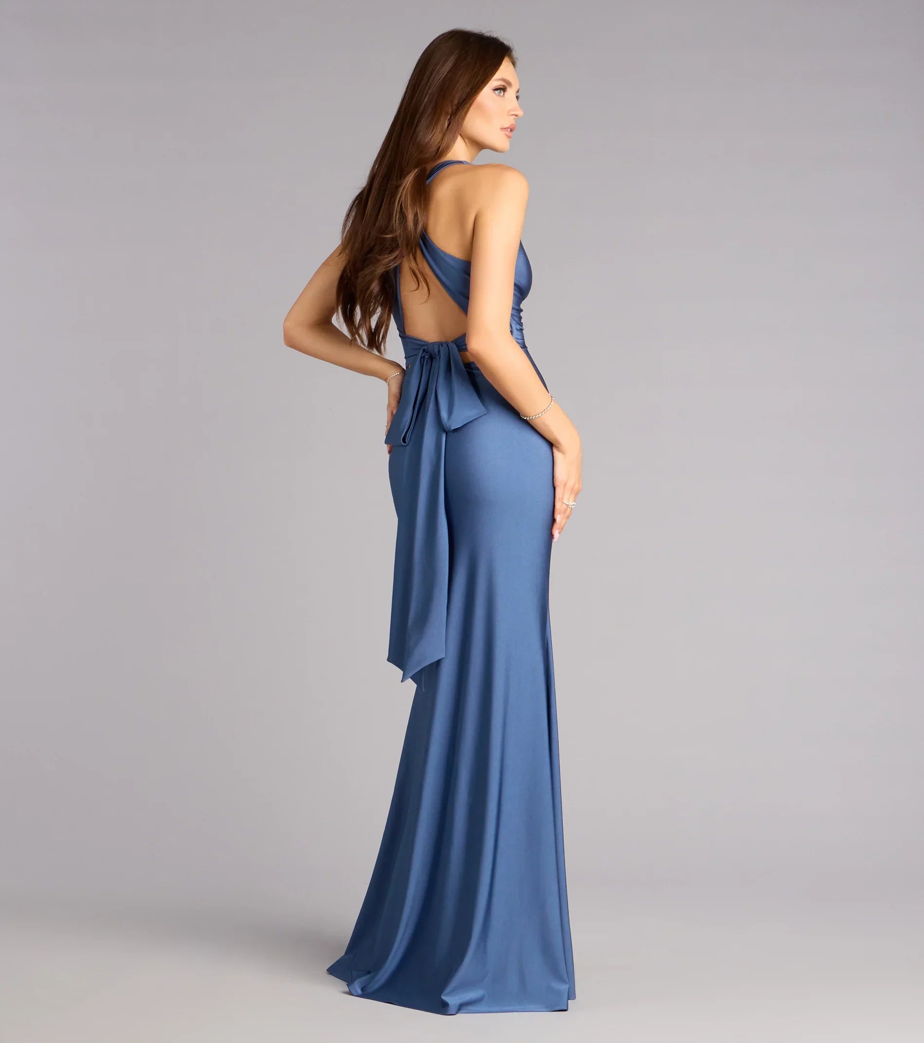 Smooth knit meets sophistication in the Adrianne formal gown, featuring a sleek mermaid silhouette, dramatic open back, and oversized bow detail. Made to move with effortless elegance, it’s your statement dress for the most unforgettable evenings.