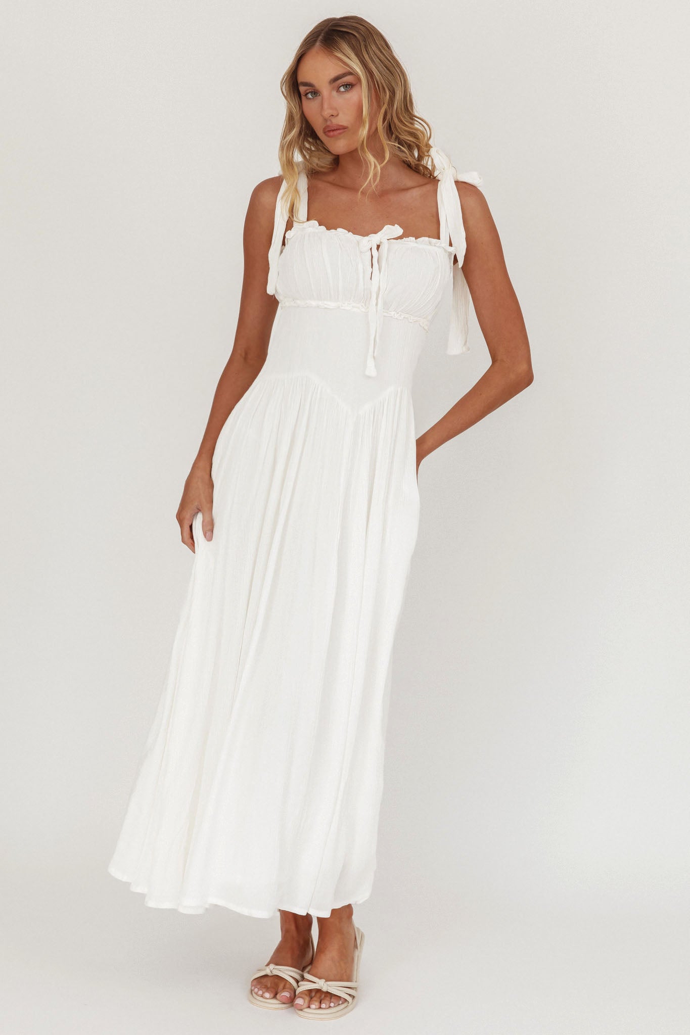 Twirl the day away in our pretty Albury midi dress. We are in love with its girly tied shoulders and flattering basque waist. It's perfect for lazy Saturdays strolling your fave farmers' market. Team it with sandals and a straw tote for a chic look we are loving.