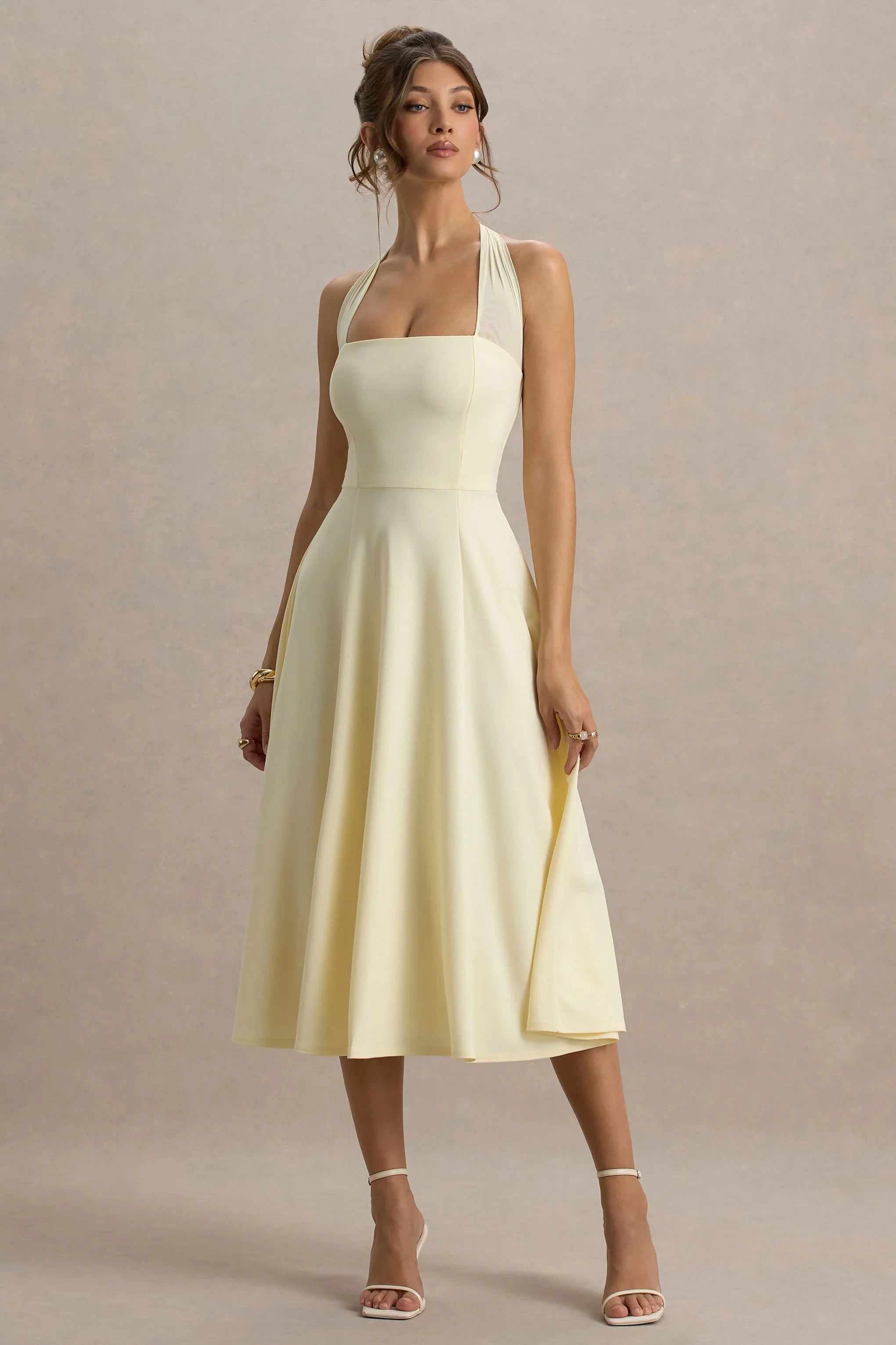 A stand-out staple, every girl needs an midi like Auburn. Expertly crafted in a premium scuba crepe, this pale lemon midi dress is detailed by a self-tie mesh halter and ethereal skater skirt.