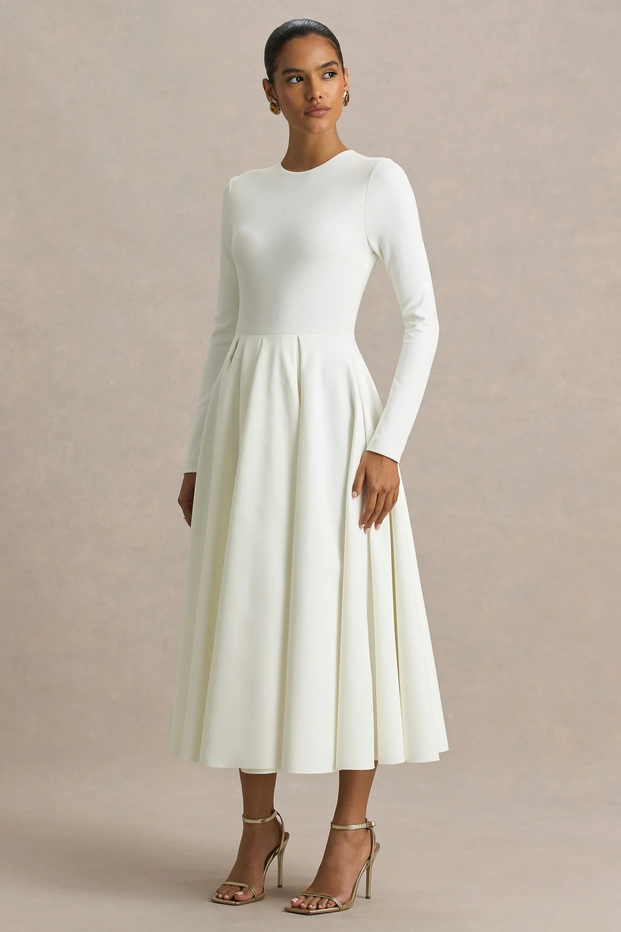 Sleek, structured, and endlessly sophisticated, meet Bellamy. Crafted from our premium scuba crepe in a rich cream hue, this midi silhouette is all about timeless elegance with a modern twist. Designed with a clean crew neckline and long, sleeves, Bellamy creates a streamlined shape that enhances your curves while keeping the look elegantly refined. Style with striking earrings and a sleek up do, for a look that'll capture the rooms attention.