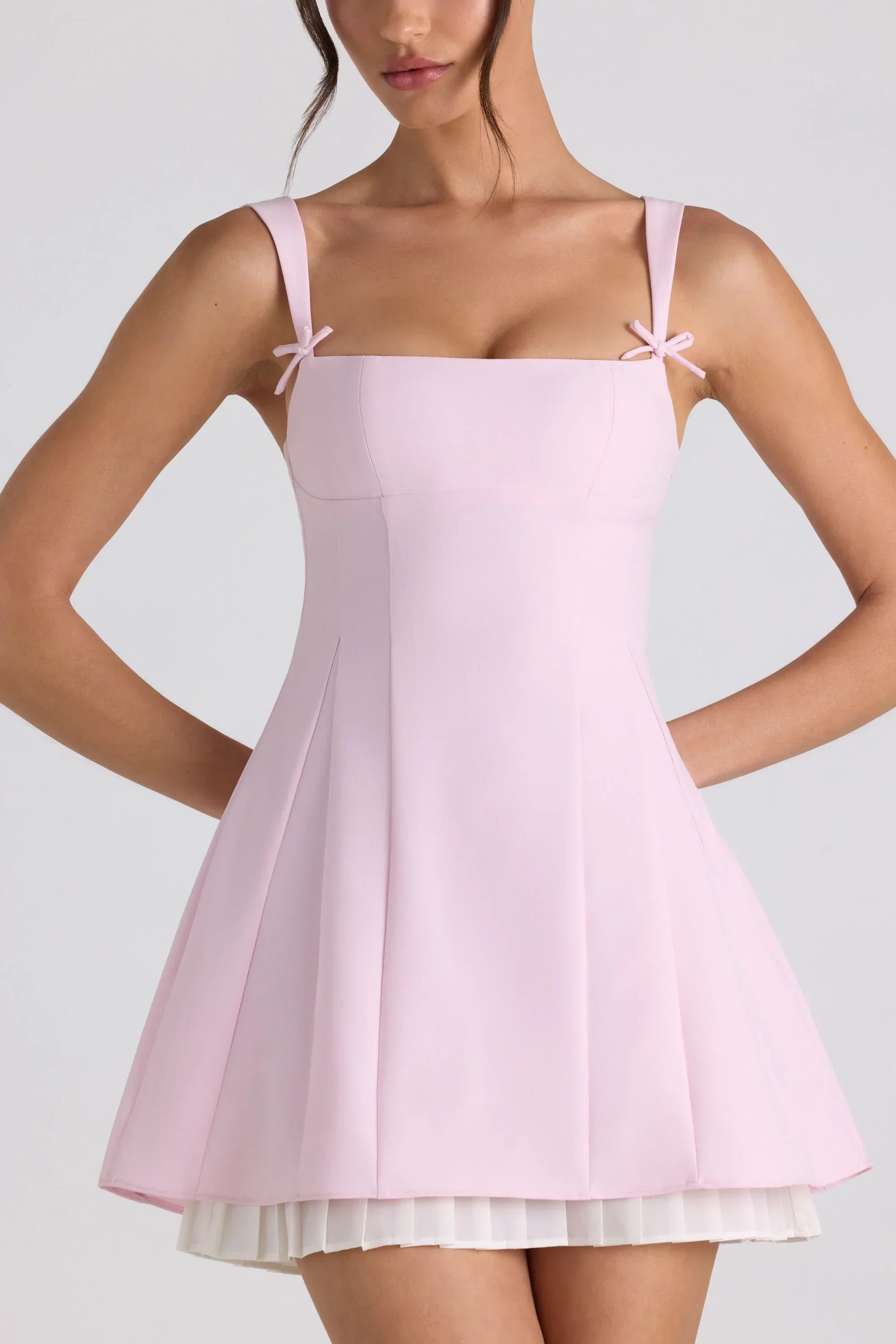 A whimsical silhouette designed for sun-kissed days. Crafted from a woven stretch fabric that contours to your curves, the Cressida mini dress is a sweet design that’s underlaid with a contrasting pleated georgette skirt. Available in two standout hues, it’s cut to an A-line silhouette with shaping princess seams, a Bardot scoop neckline, and adjustable shoulder straps with functional rouleau ties.
