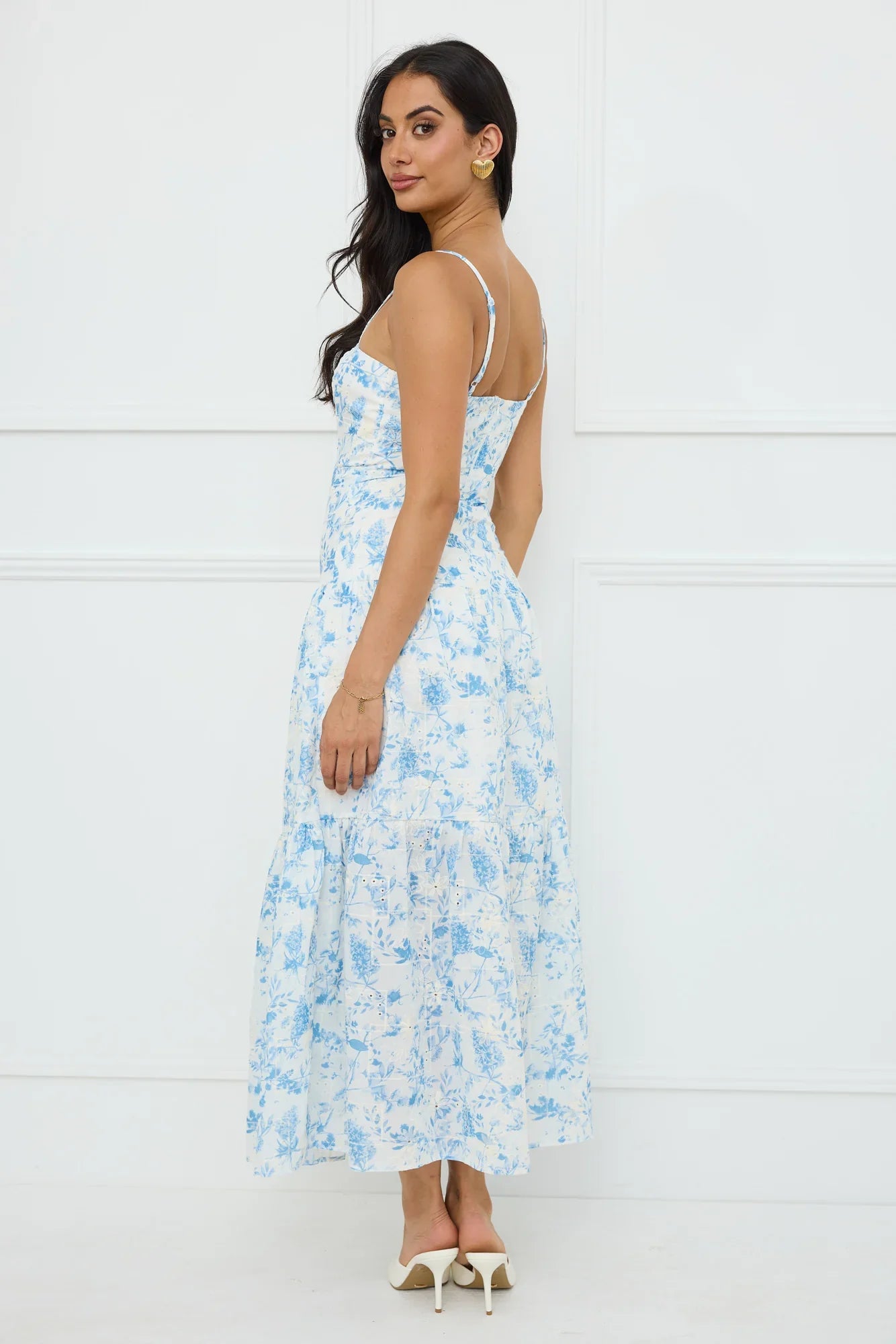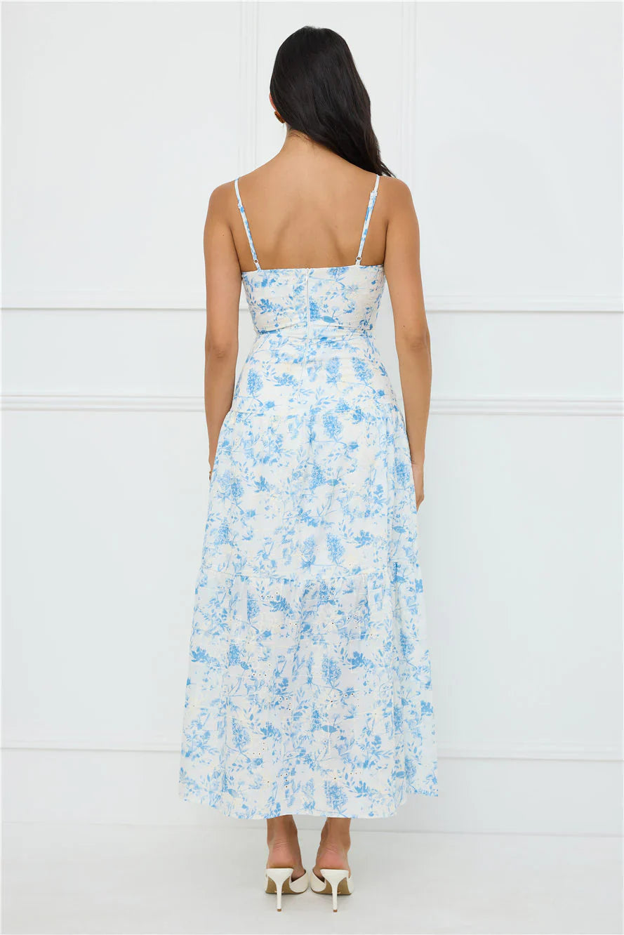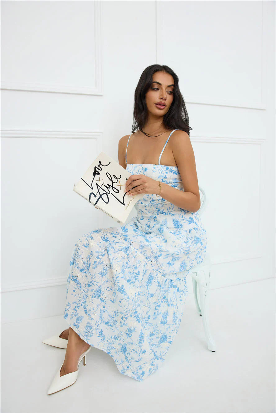 A gorgeous style for daytime events. The Bright Mornings Maxi Dress features a flowy design, beige embroidery and a lovely blue print. Style with sandals for a 'fit we're wearing all summer.