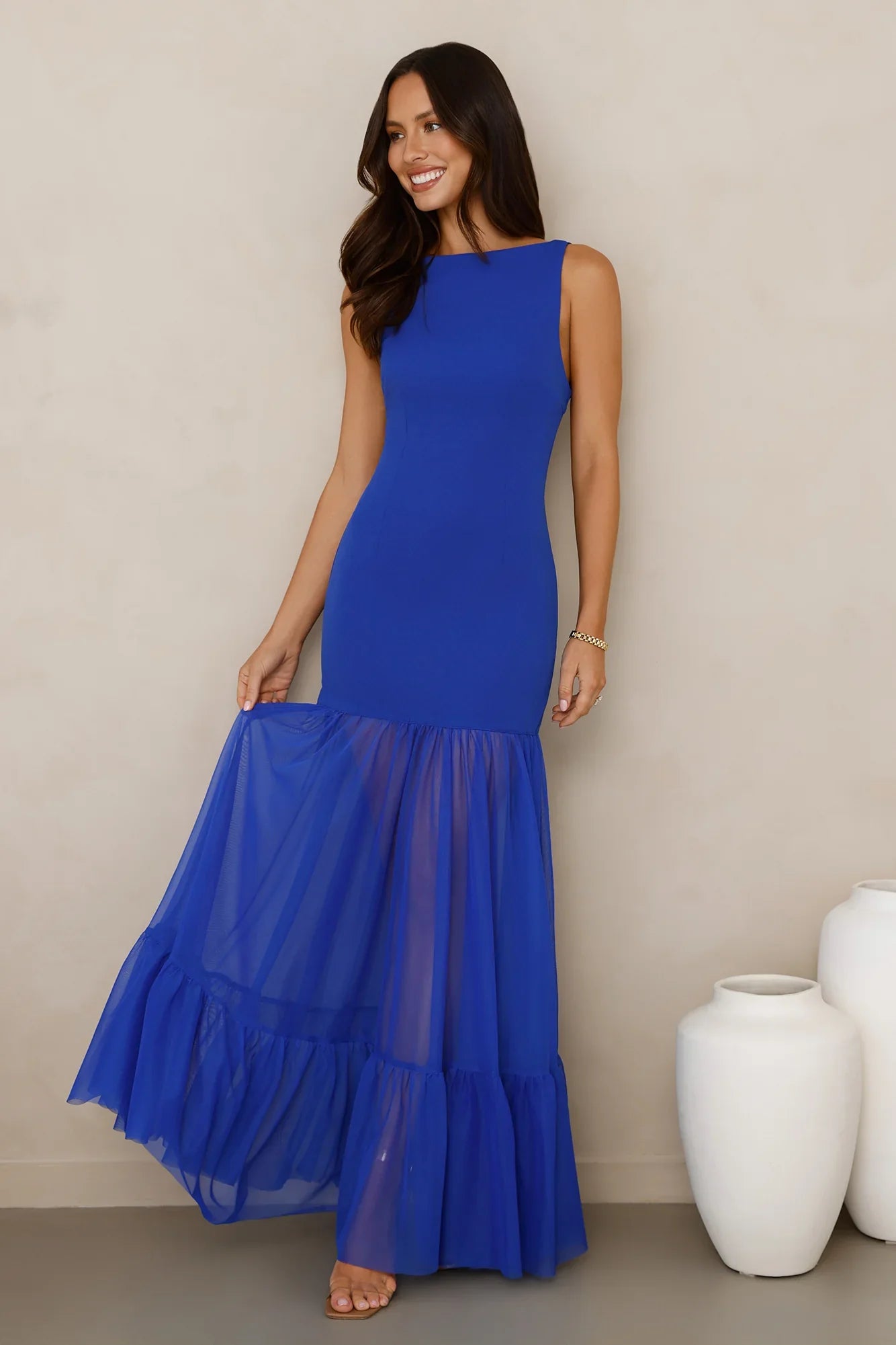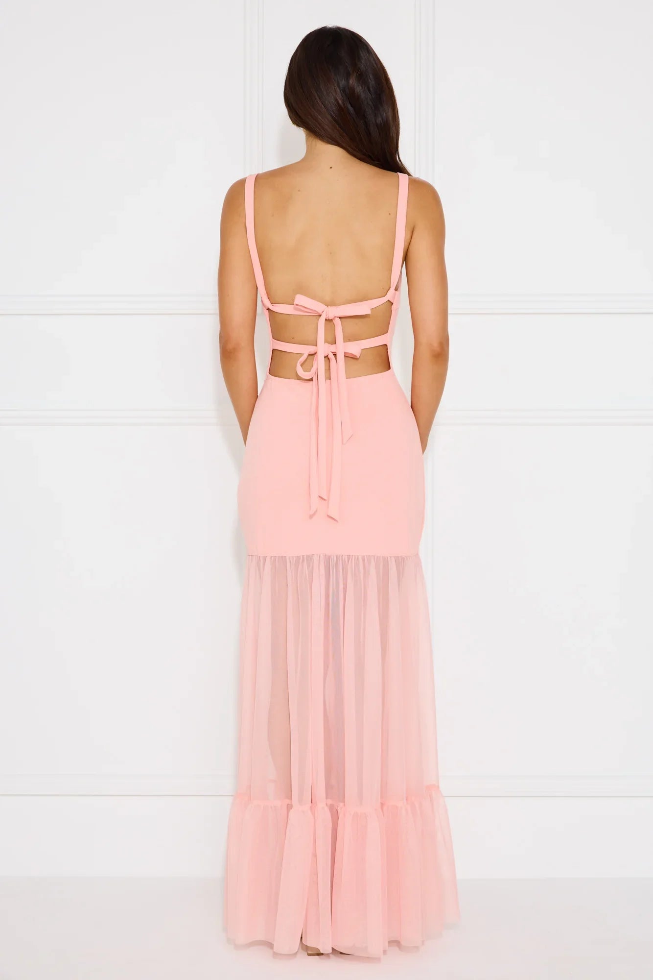 Dress to impress in the Chic Whispers Maxi Dress. Featuring a gorgeous sheer mesh skirt and a tie-up back that'll have the spotlight on you! Style with heels and curls for a 'fit that'll crown you best-dressed!