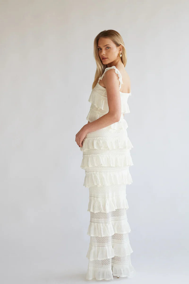The Colette Crochet Tiered Ruffle Top and Maxi Skirt Set calls for a dream vacation! This stunning set is complete with a square neck tank top and a low rise maxi skirt that feature a tiered ruffle knit crochet design. Finish off these vacay ready look with some gold !