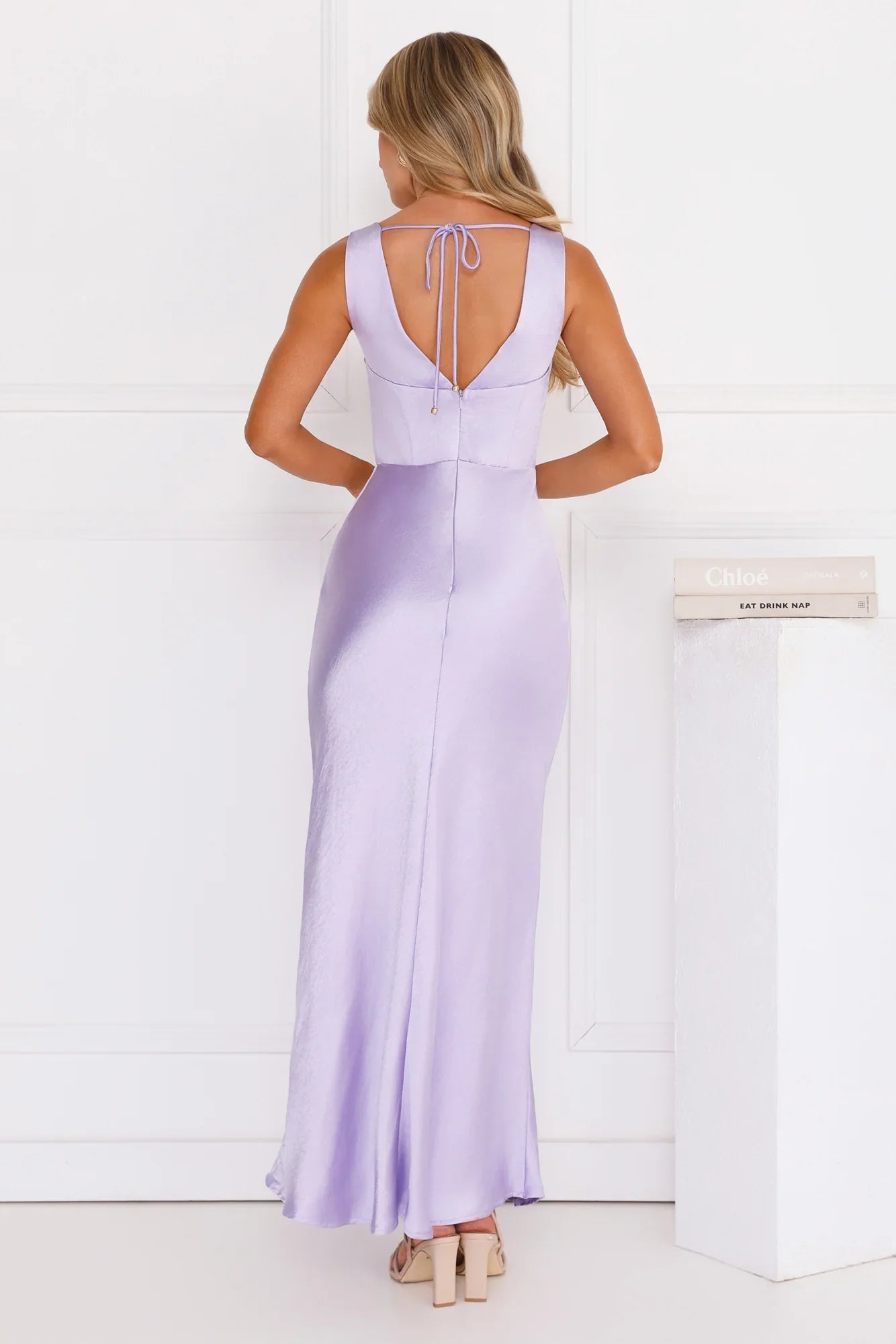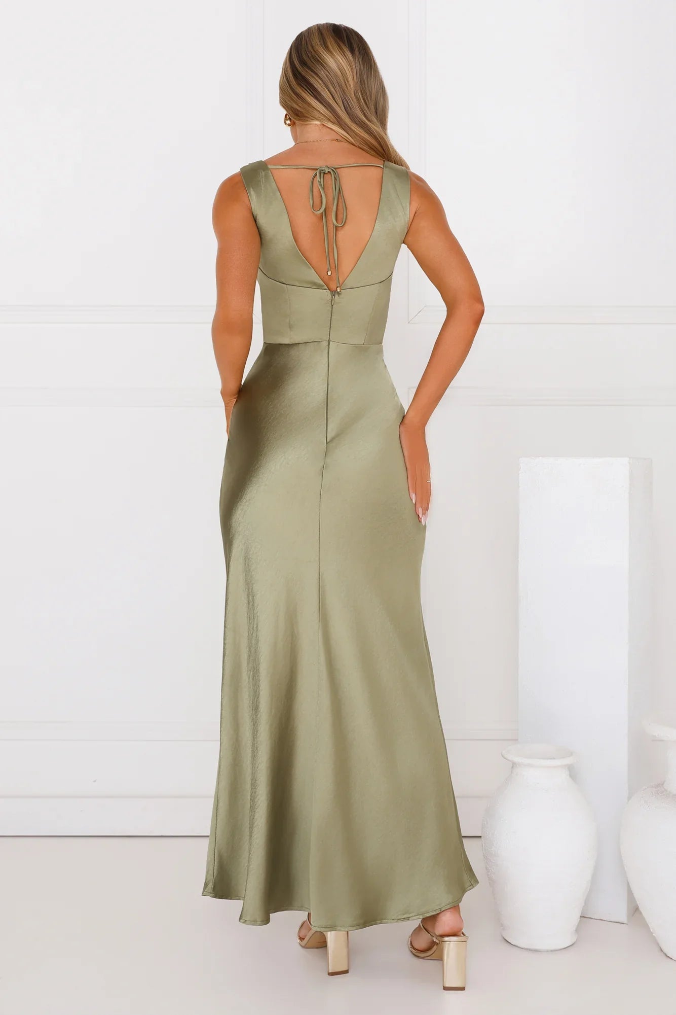 The Crystal Luxe Satin Maxi Dress is your go-to for timeless glam. Featuring a silky satin fabric, a draped cowl neckline, and a fitted bodice that flows into a breezy skirt. The elegant V-back with a delicate tie detail adds just the right amount of romance for unforgettable nights. Style with heels.