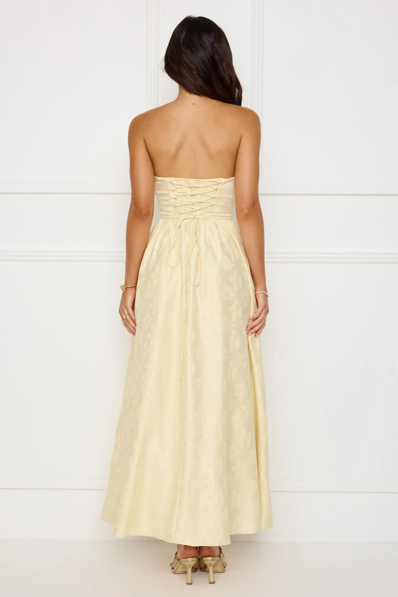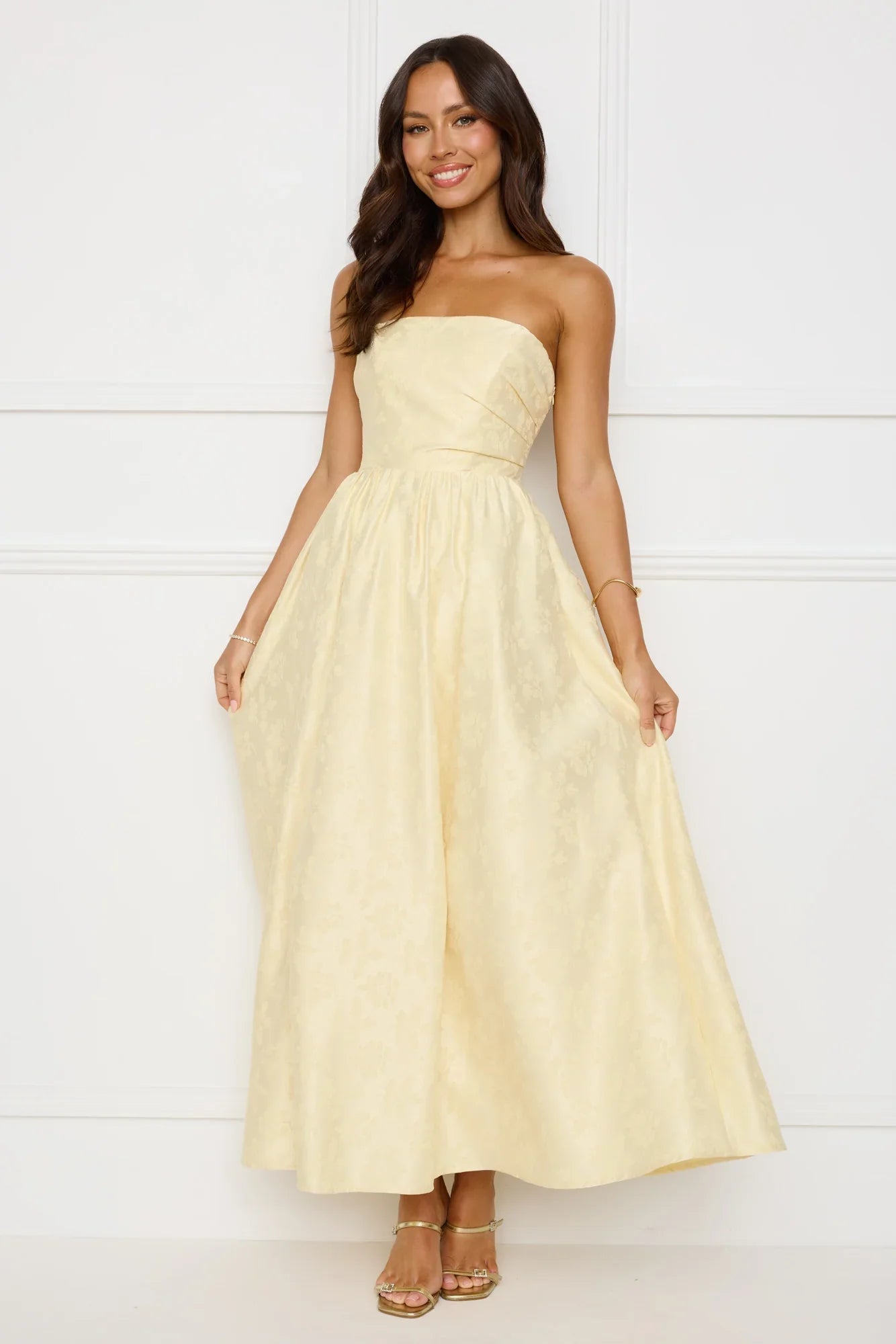 Be admired for your style in the Dancing In Magic Strapless Maxi Dress. Featuring a strapless design, a crisscross back and boning to the bodice. Style with heels to highlight the voluminous skirt.