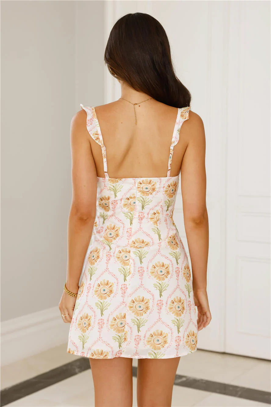 Your new fave dress is here. The Delights Mini Dress features a flowy skirt, a front tie to the neckline and a pretty print - we're in love! Style with sandals in the summertime.