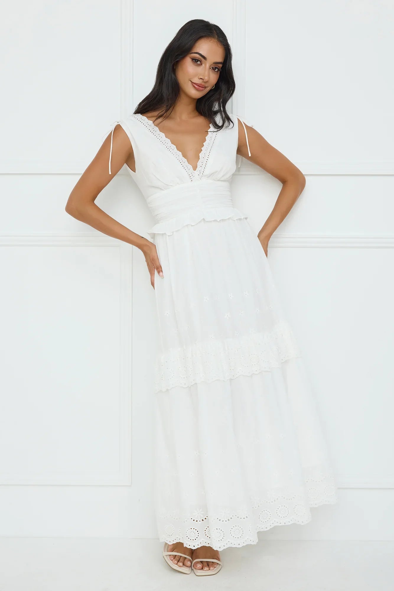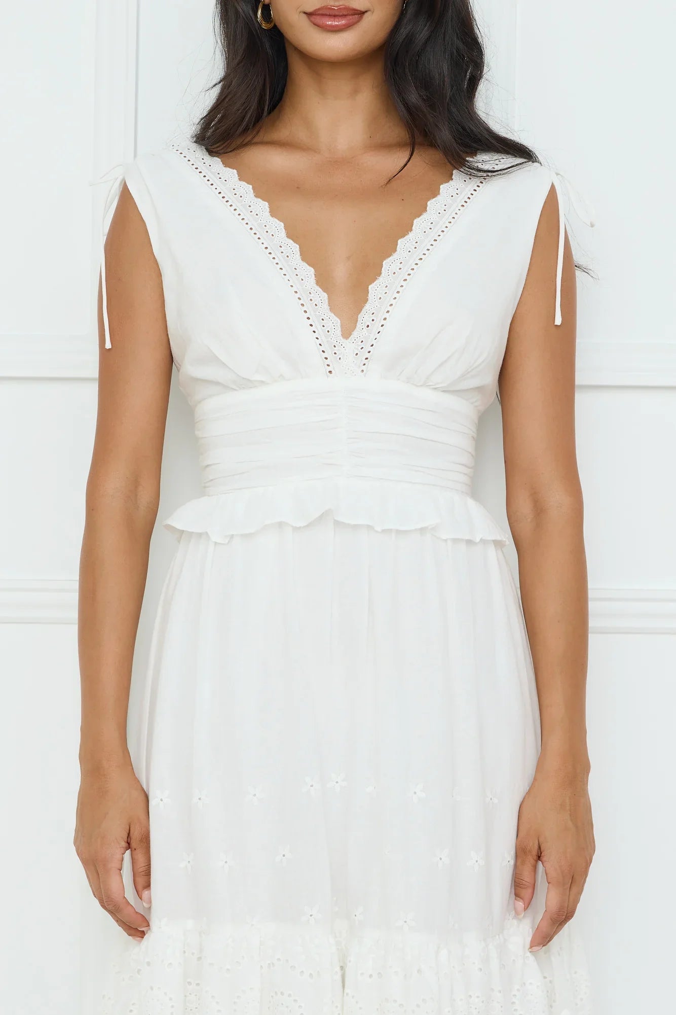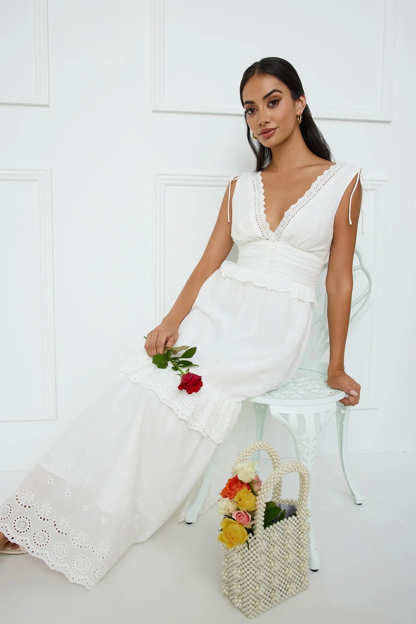 Be admired for your style in the Desert Oasis Maxi Dress. Featuring a V-neck, drawstring ties to the shoulders and a flowy skirt with dainty embroidery. Style with sandals and beachy waves.