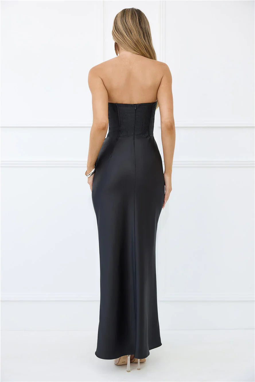 The Dressed To Dazzle Strapless Satin Maxi Dress features a structured bodice with boning, a gathered detail to the satin skirt and a gorgeous strapless neckline. Style with heels and sparkly accessories.