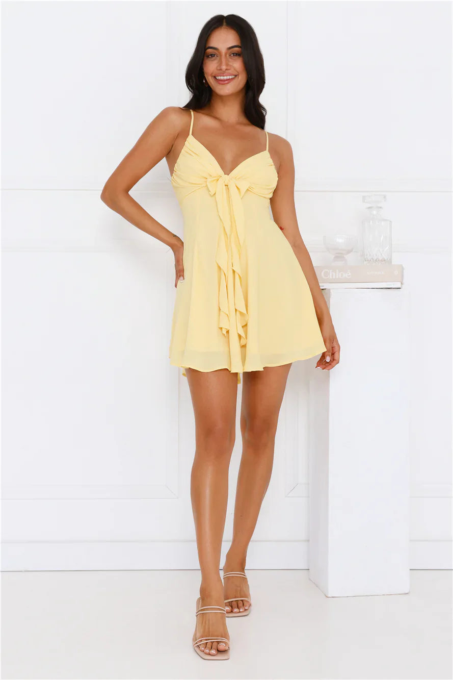 We're in love with the Earth Essence Mini Dress. Featuring a gorgeous bow with a frill detail and a flowy skirt. Style with heels and curls for all the attention.