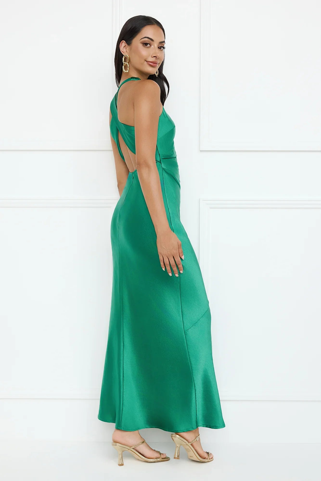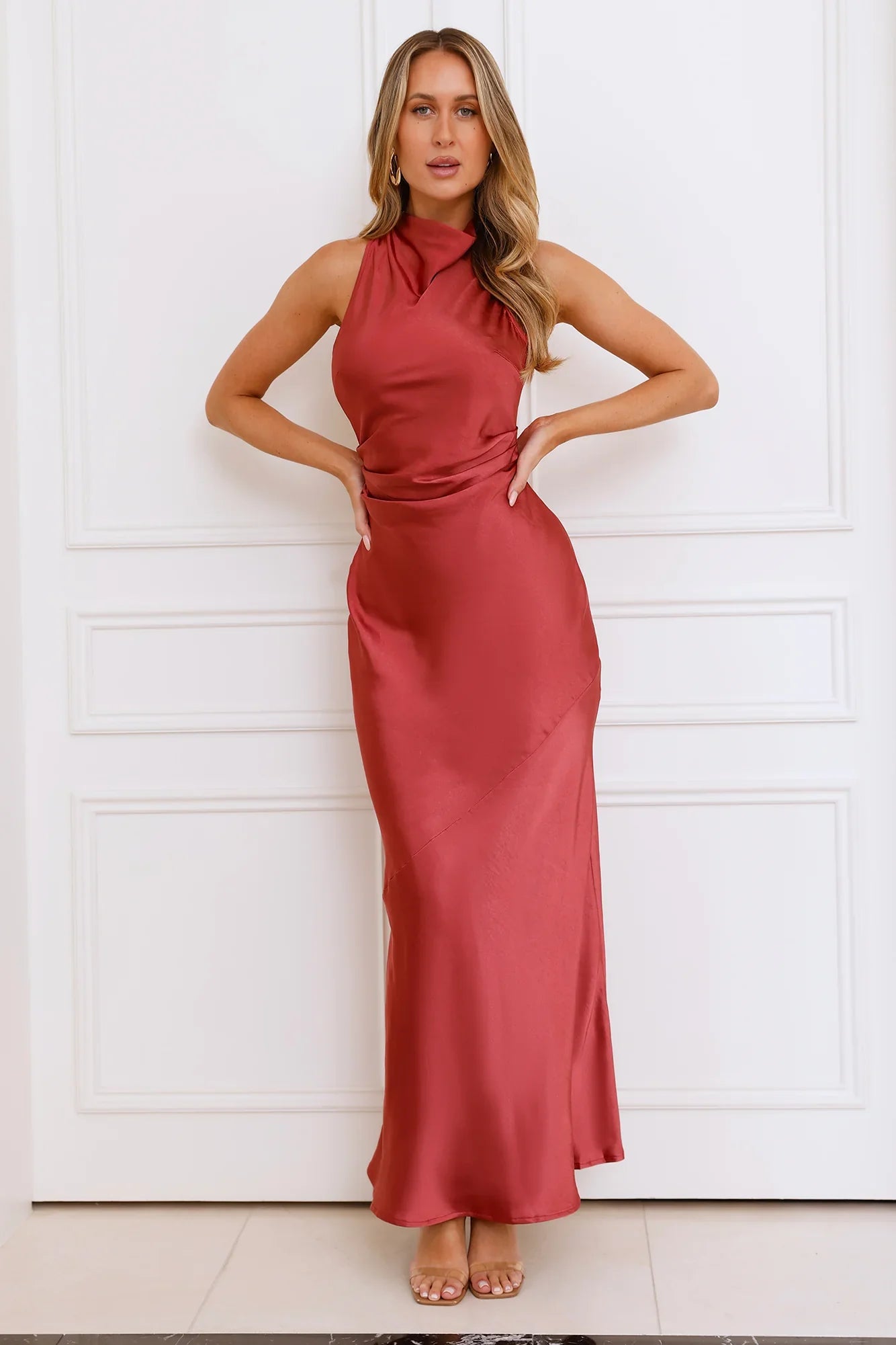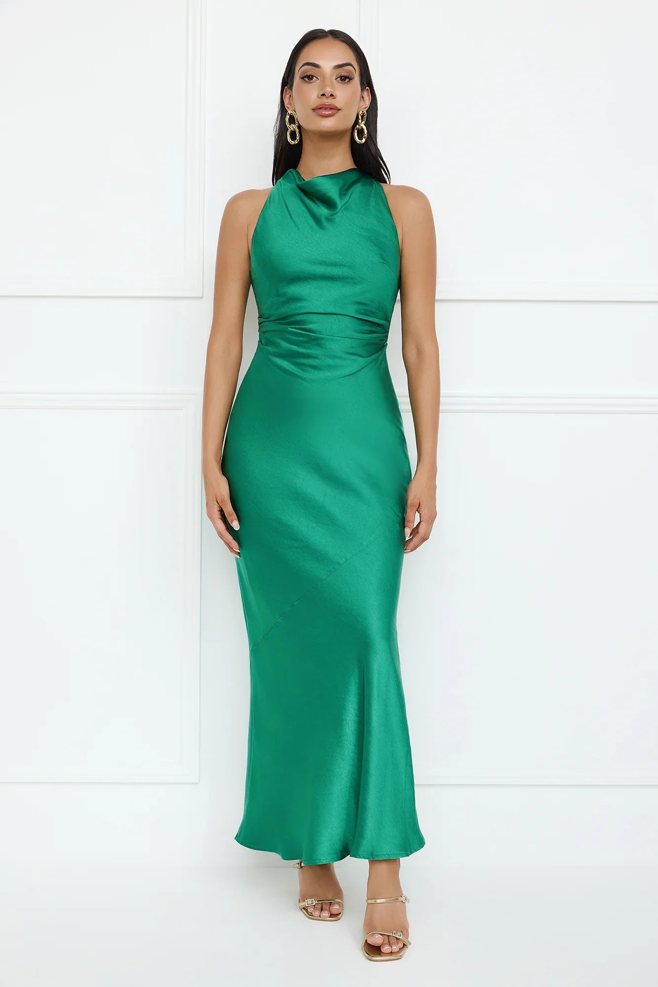 Lovely, this is the perfect guest dress! The Eden Satin Maxi Dress features a crossover back, a high cowl neck, and a gathered waist. Style with heels for a gorgeous 'fit.