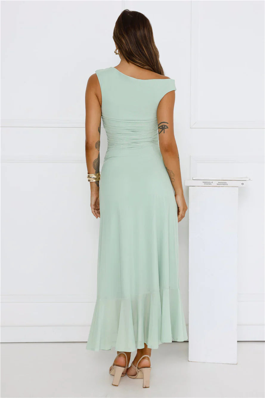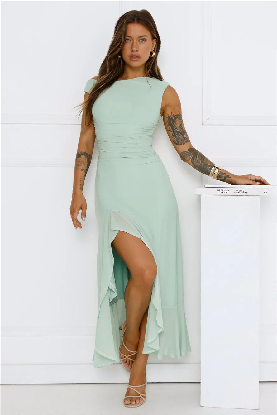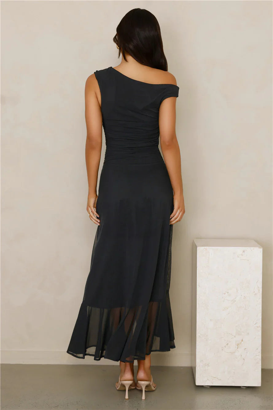 The Effortless Girl Off Shoulder Mesh Midi Dress offers a chic off-the-shoulder style with a flowy hem and a daring split to the skirt. Made from stretch mesh, this dress combines comfort with effortless elegance. Style with heels.