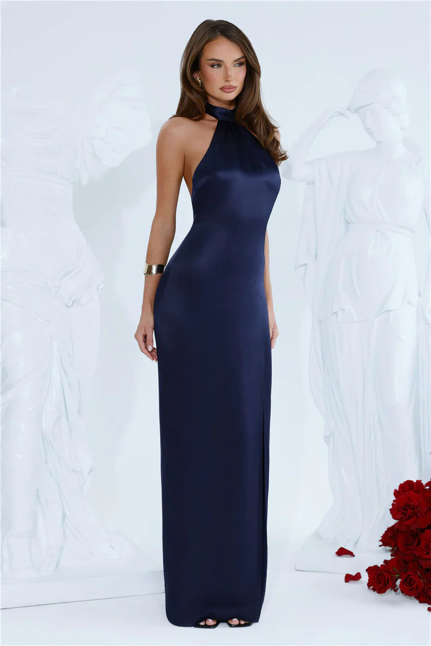 Turn heads in the Effortless Luxe Halter Satin Maxi Dress. With a halter neckline, a flowing train at the back, and a striking split to the skirt, this satin maxi dress balances drama and elegance effortlessly. Style it with heels and jewellery for a formal evening.