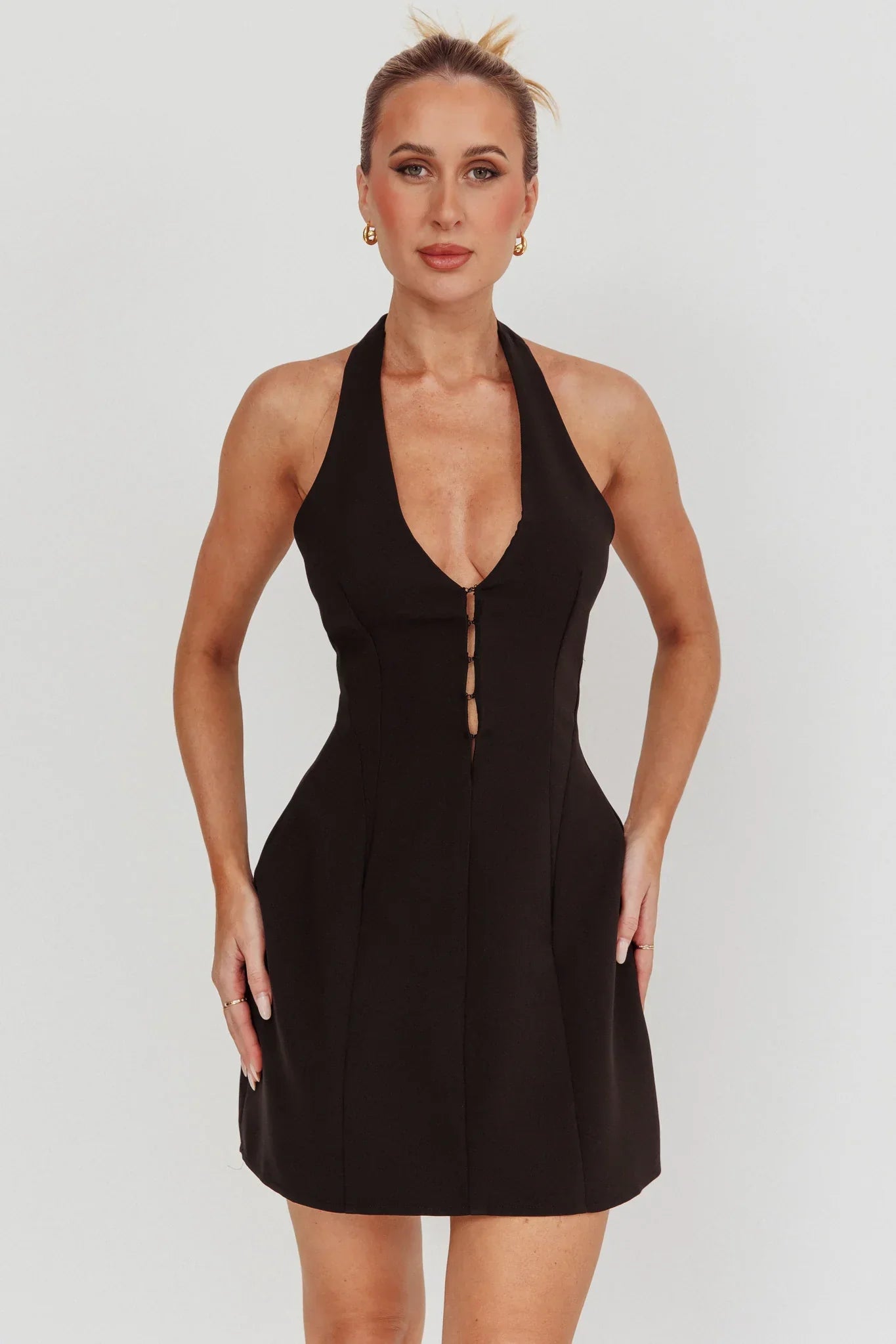 Discover the epitome of chic charm with our Elisabet mini dress. Designed to accentuate your curves with its flattering a-line silhouette and halter neck. Perfect for a spring date or a night out on the town. Complete your look with your favorite jewelry!