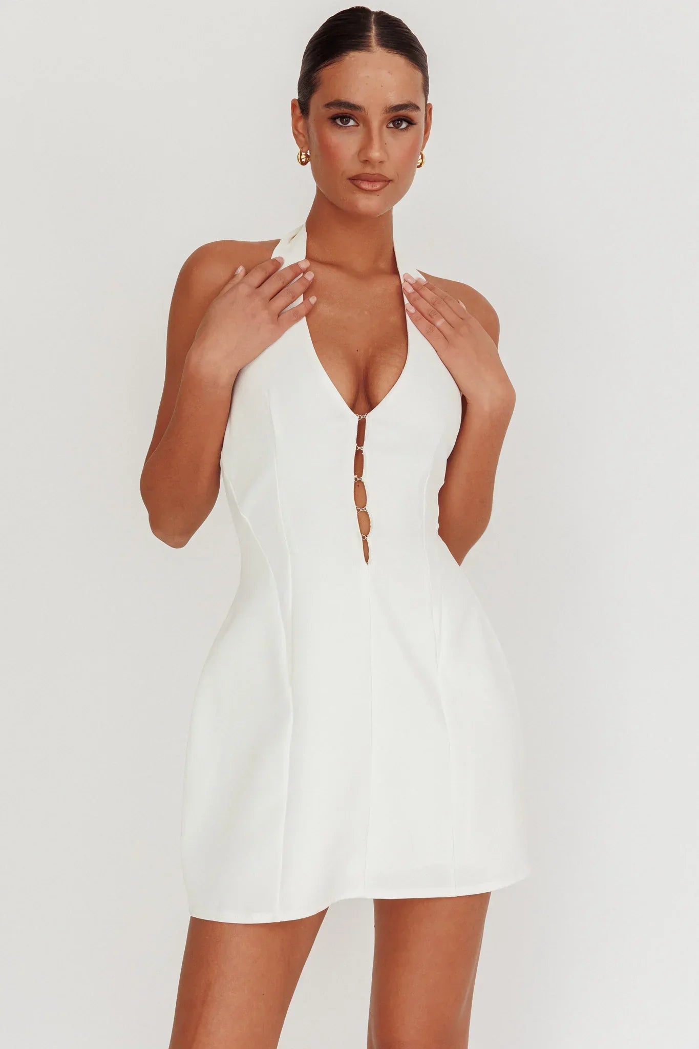 Discover the epitome of chic charm with our Elisabet mini dress. Designed to accentuate your curves with its flattering a-line silhouette and halter neck. Perfect for a spring date or a night out on the town. Complete your look with your favorite jewelry!