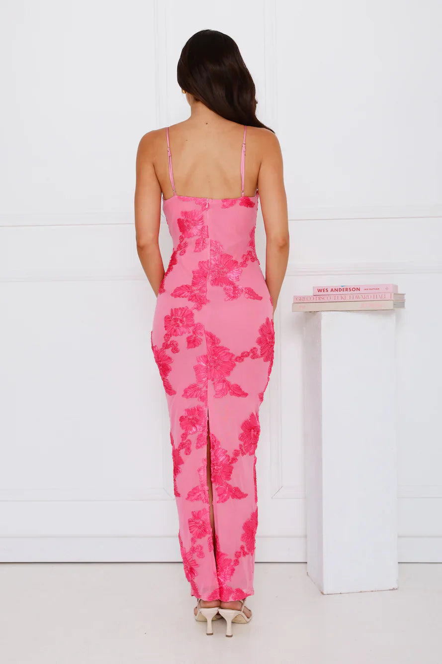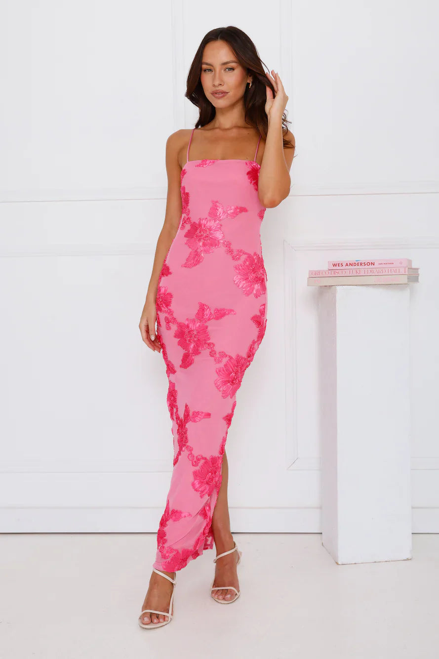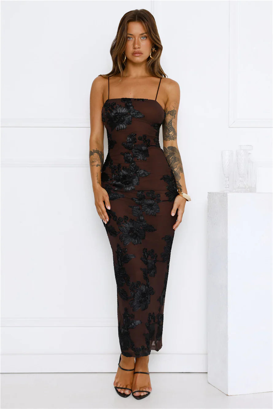 She's impressive, lovely. The Estelle Mesh Maxi Dress features a mesh silhouette with a gorgeous satin-like embroidered design. Style with heels and curls for a fancy event.