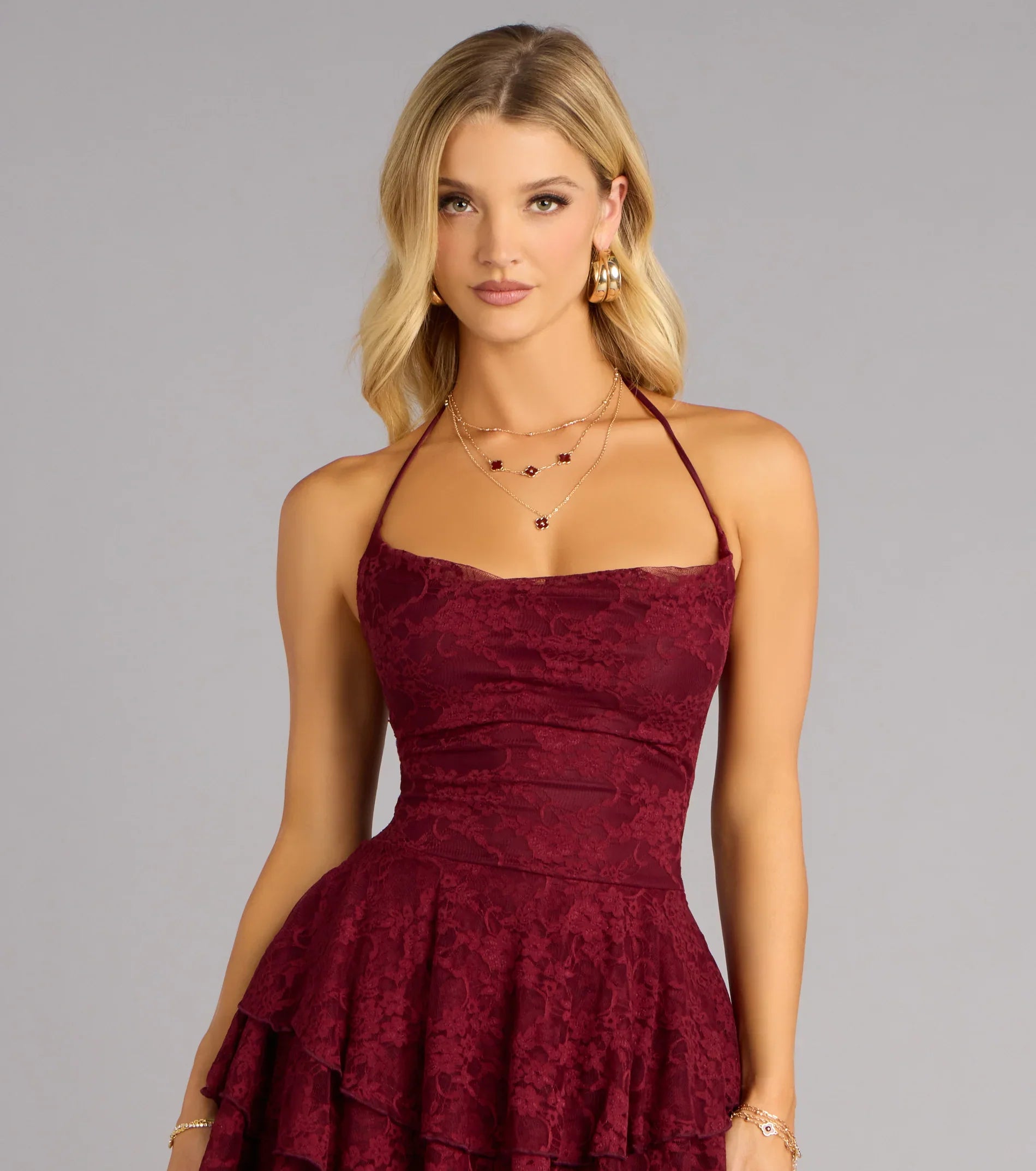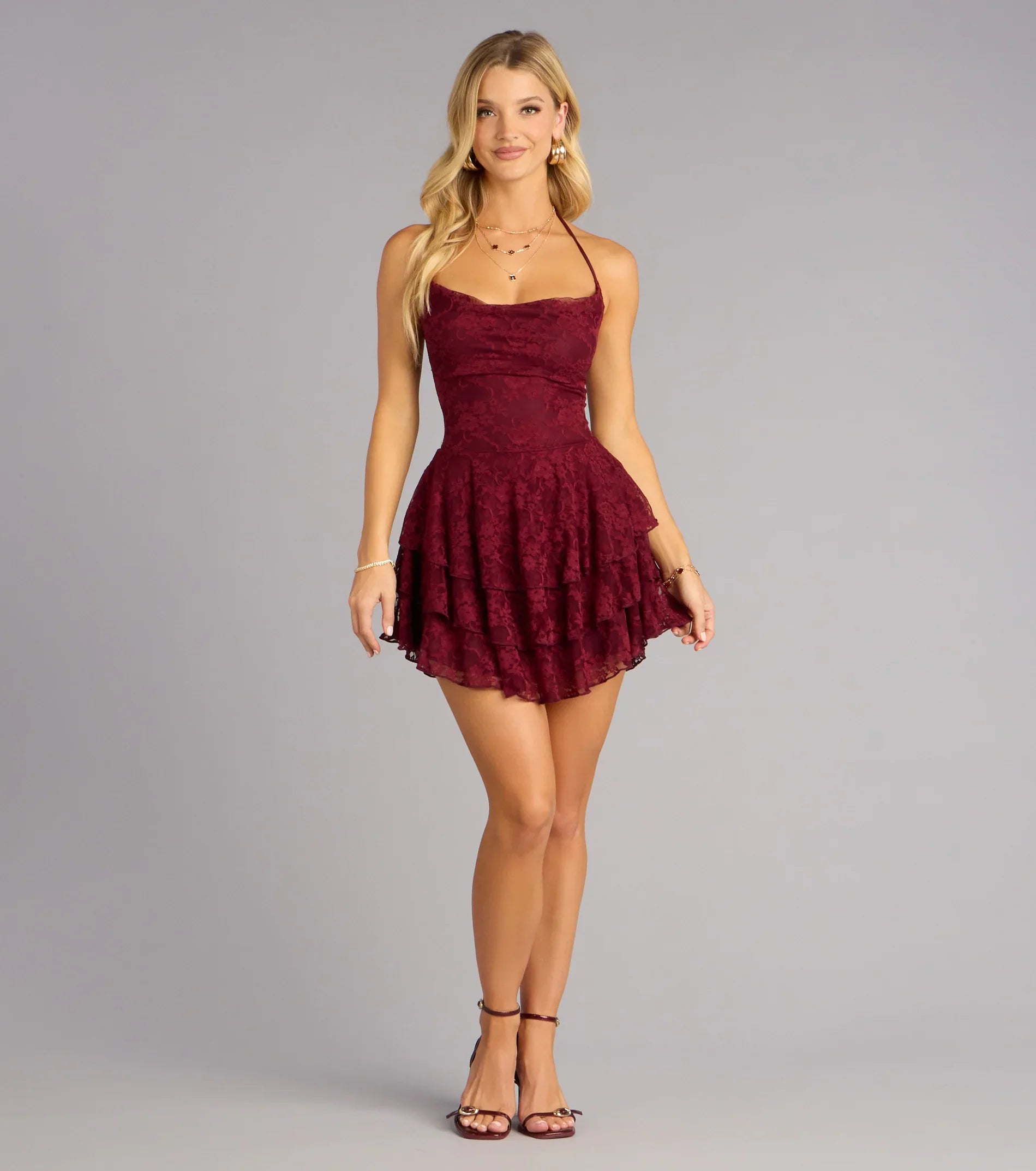 This is the dress you reach for when the plan turns into a whole night out. The lace texture and tiered skirt bring movement, while the open back keeps the look confident and fun.