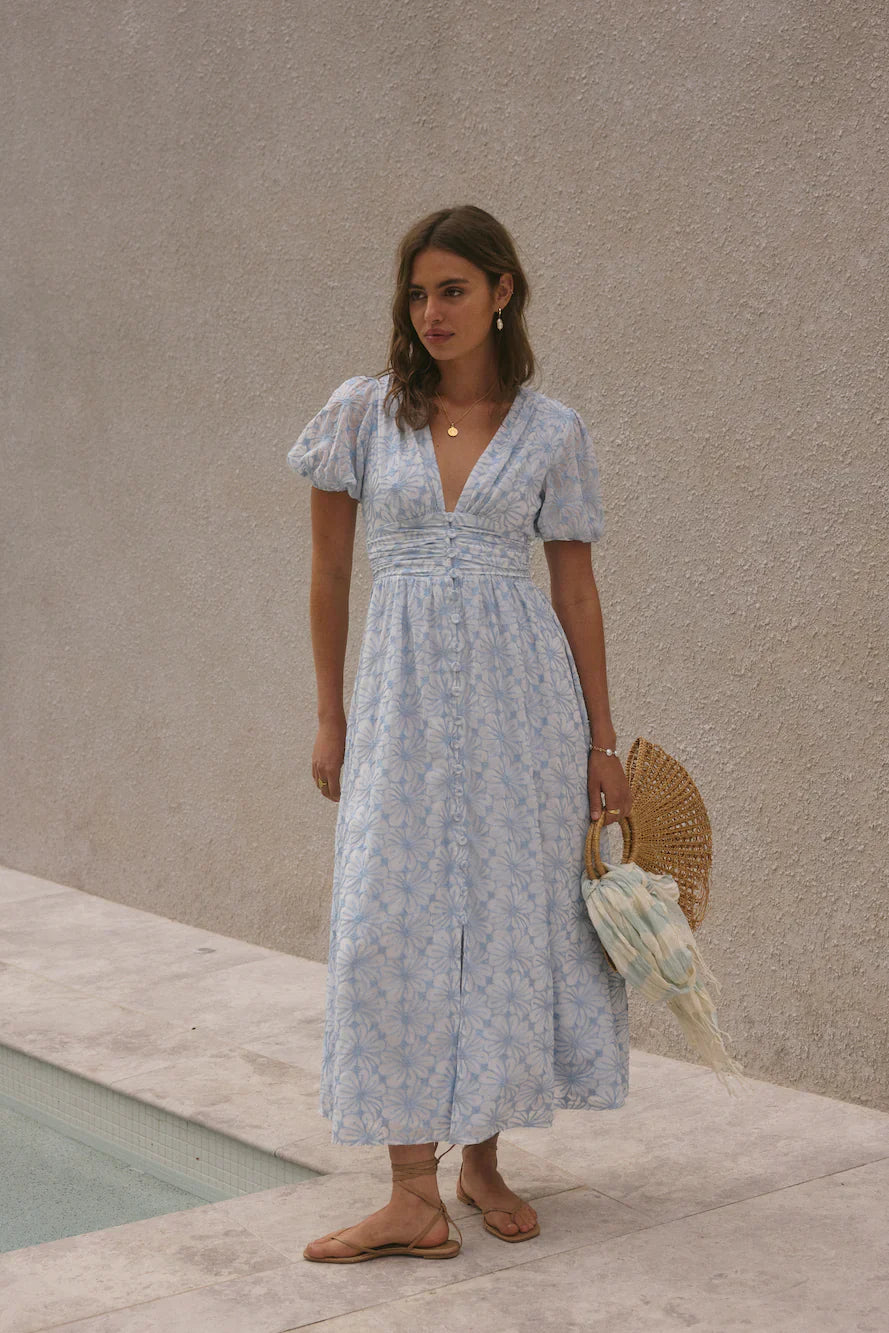 The Floral Dreams Maxi Dress in Blue exudes enchanting elegance, perfect for wandering through the lavender fields of Provence or enjoying a summer garden party. Embrace the beauty of nature in this captivating dress, designed for unforgettable moments.