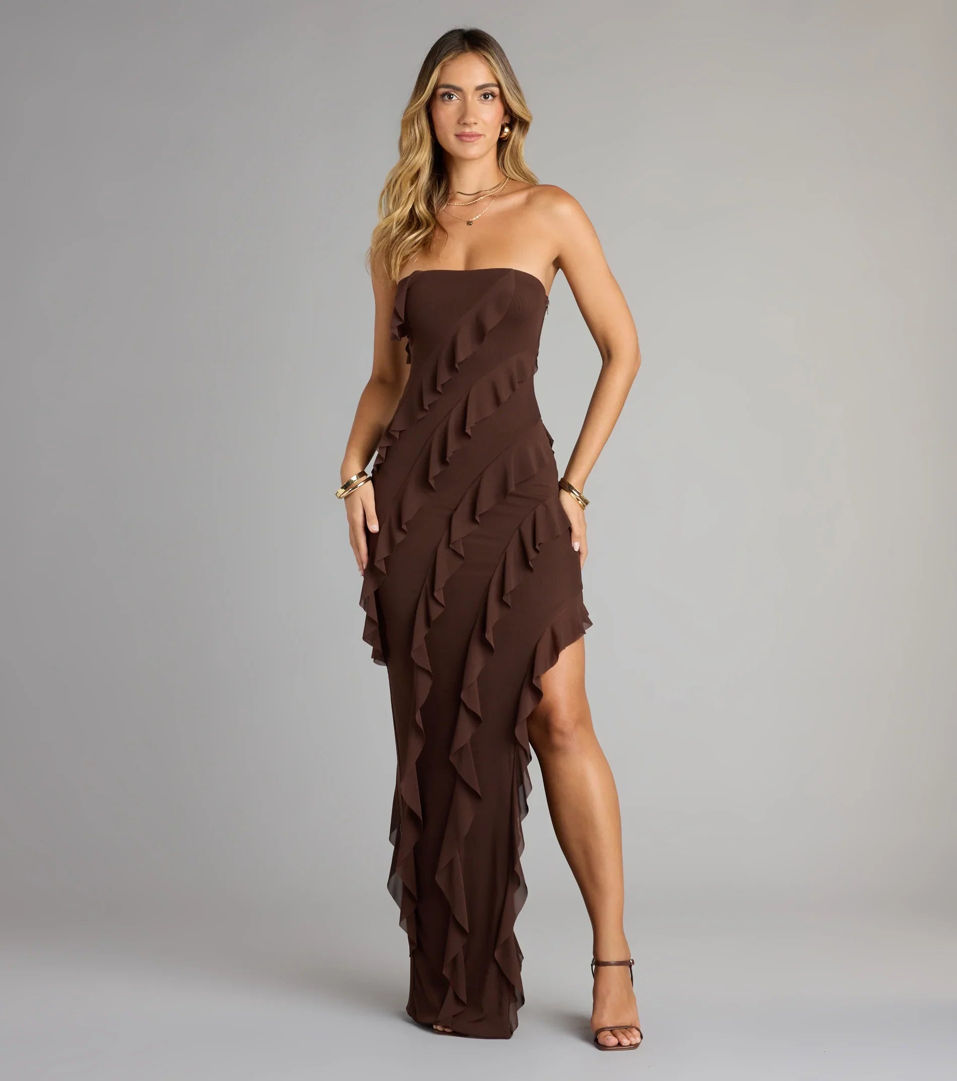 The Gabby formal long dress gives an aurora of dreamy romance with flirty ruffles, a high side slit for movement, and a form-hugging silhouette.