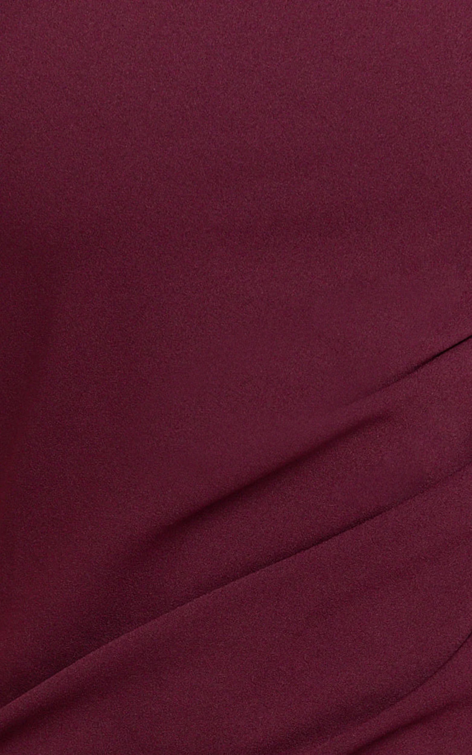 A fitted bodice flows into a sweeping silhouette with just the right amount of movement, perfect for dancing, date nights, and glam events. The rich wine hue taps into Sheer Statements energy without the reveal, while subtle volume through the skirt nods to Pump Up the Volume for a modern, romantic finish.