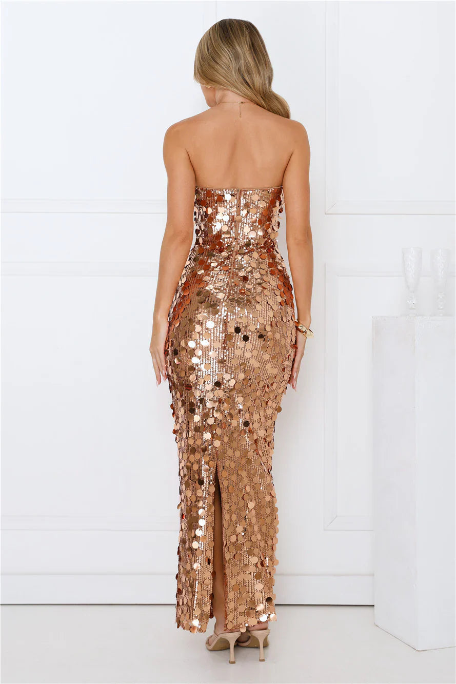 The Glistening Grandeur Strapless Sequin Maxi Dress is a showstopper of elegance and sparkle. It features a strapless U neckline and shimmering sequins. This dress catches the light with every step, creating a gorgeous sparkling effect. Style with heels and curls to turn heads!
