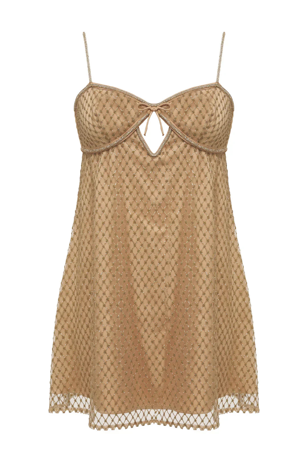A Highly Coveted FL&L style, the bestselling Glitter gold slip dress enchants all year round. Coated in rhinestone embellishments, this embellished mini dress spotlights keyhole cutout accents.