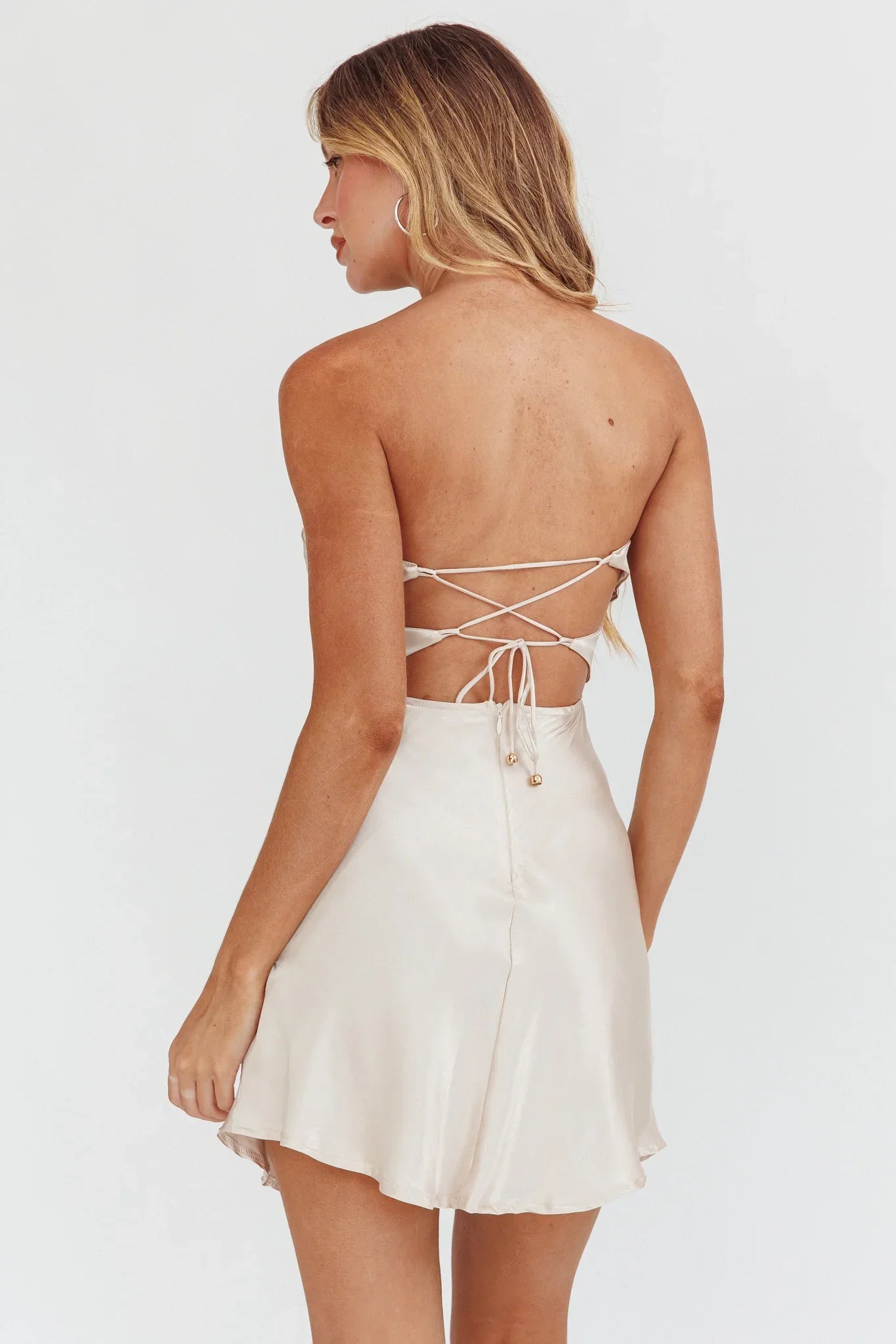 You'll go straight to the best-dressed list in our Good Impression mini dress. We're obsessed with its cute double twist feature in the bodice and lace-up back. Perfect for a bachelorette or special occasion. Team it with diamante heels and a clutch for an unforgettable look.