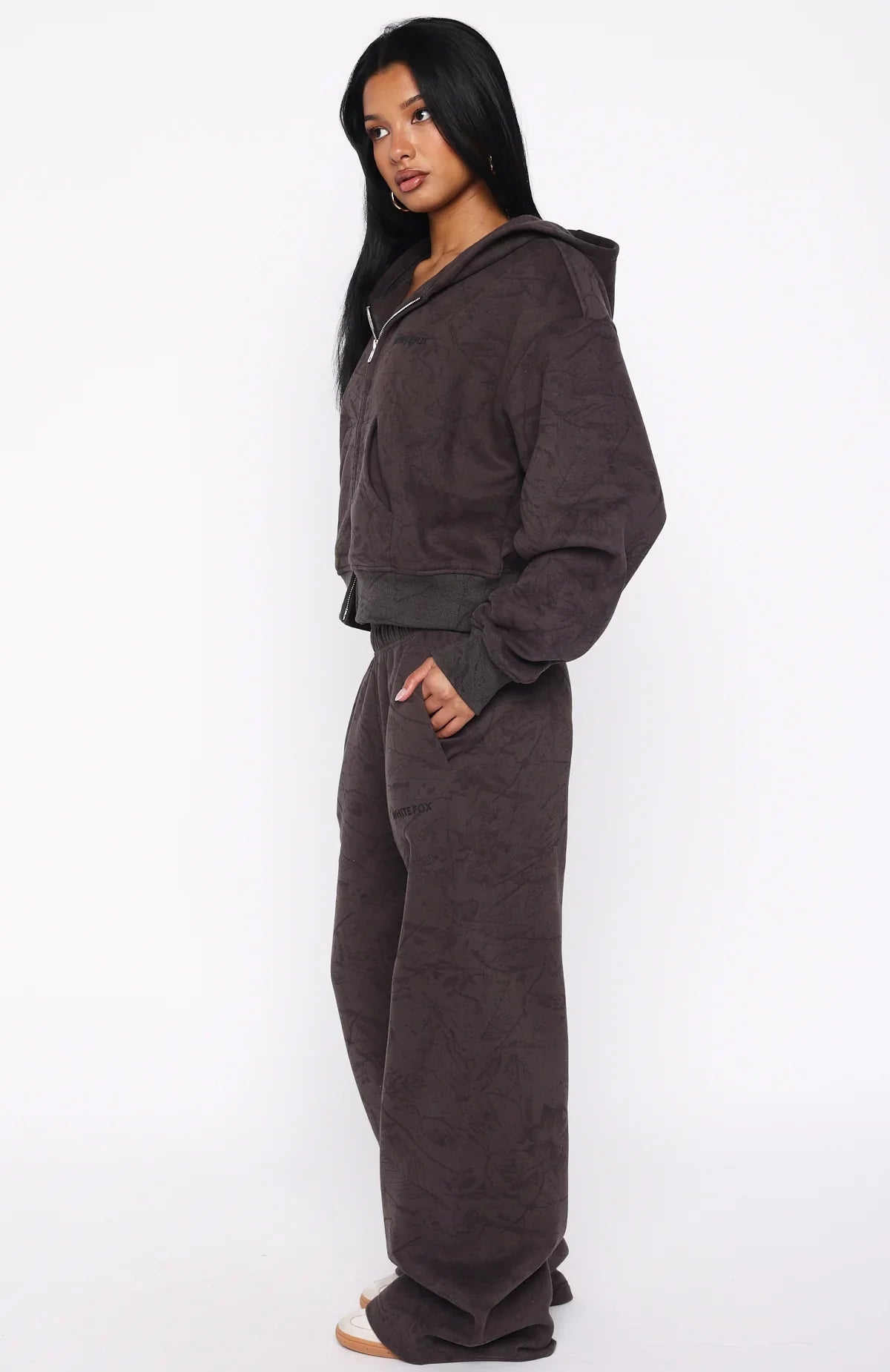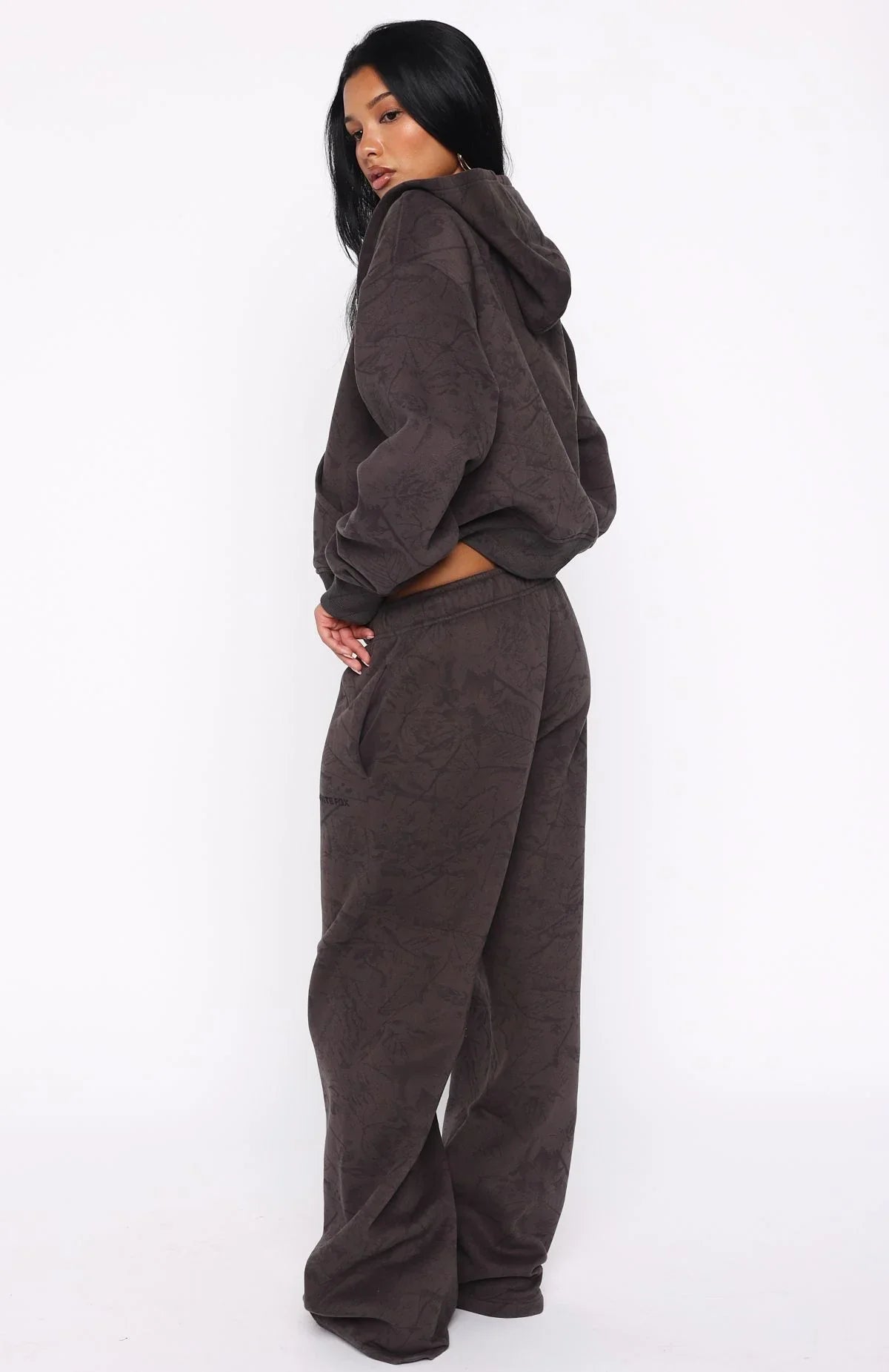 From couch cuddles to coffee runs, this set does it all. The Hiding Away Wide Leg Sweatpants Dark Camo are designed with a thick elasticated waistband featuring an internal drawstring tie, side pockets, and a wide-leg silhouette. The White Fox puff-print text at the side adds a signature touch, while the unlined fleece interior ensures a cozy feel. Style with the matching Hiding Away Boxy Zip Front Hoodie Dark Camo.