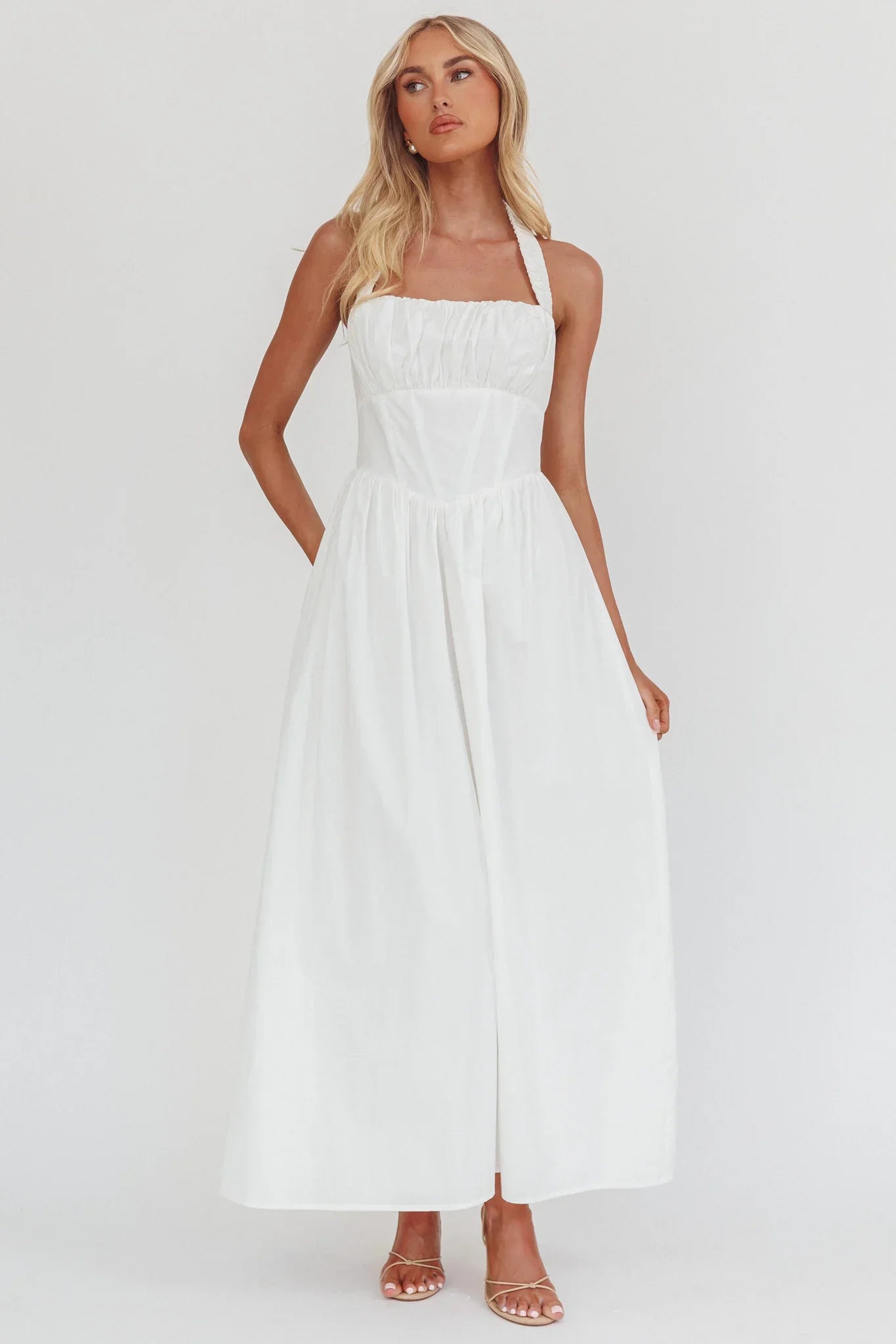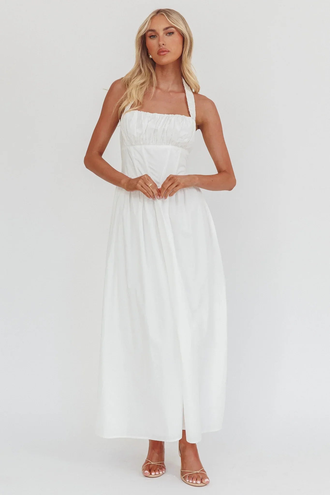 Hello, gorgeous! You will turn heads in our adorable Irisa maxi dress. It features a halter neckline and gathering in the bust and is perfect for a romantic date night. Team it with kitten heels and a tote for a look that will have everyong asking you, "Where'd you get your dress?!"