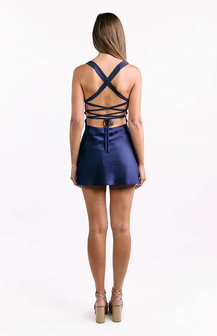 Navy Satin Lace-Up Mini Dress