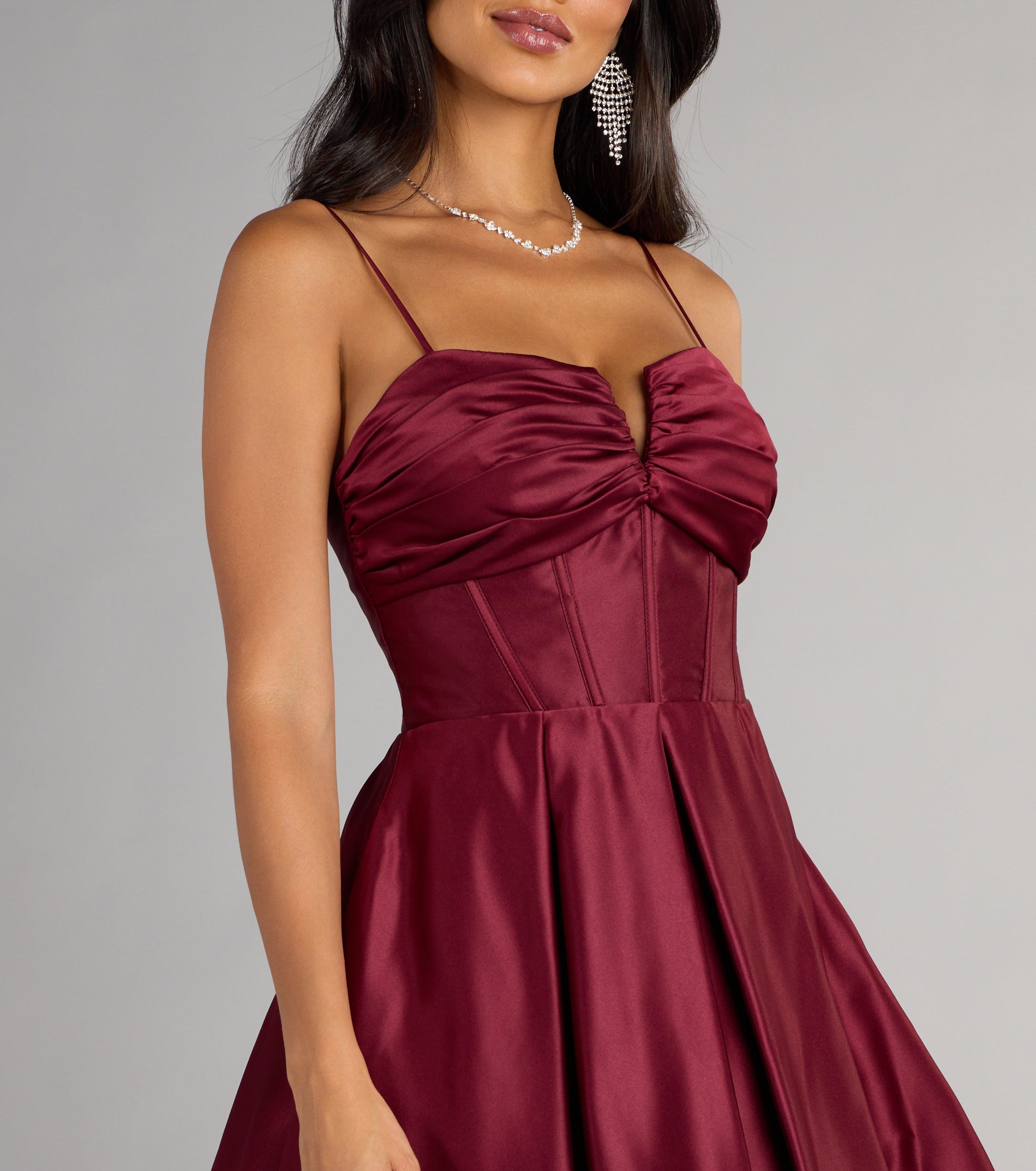 Made for the nights you won’t forget, the Joelle satin skater dress pairs a structured corset bodice with a twirl-worthy moment. With delicate straps, a lace-up back, and a pleated fit-and-flare silhouette, it’s the perfect mix of polished and playful.