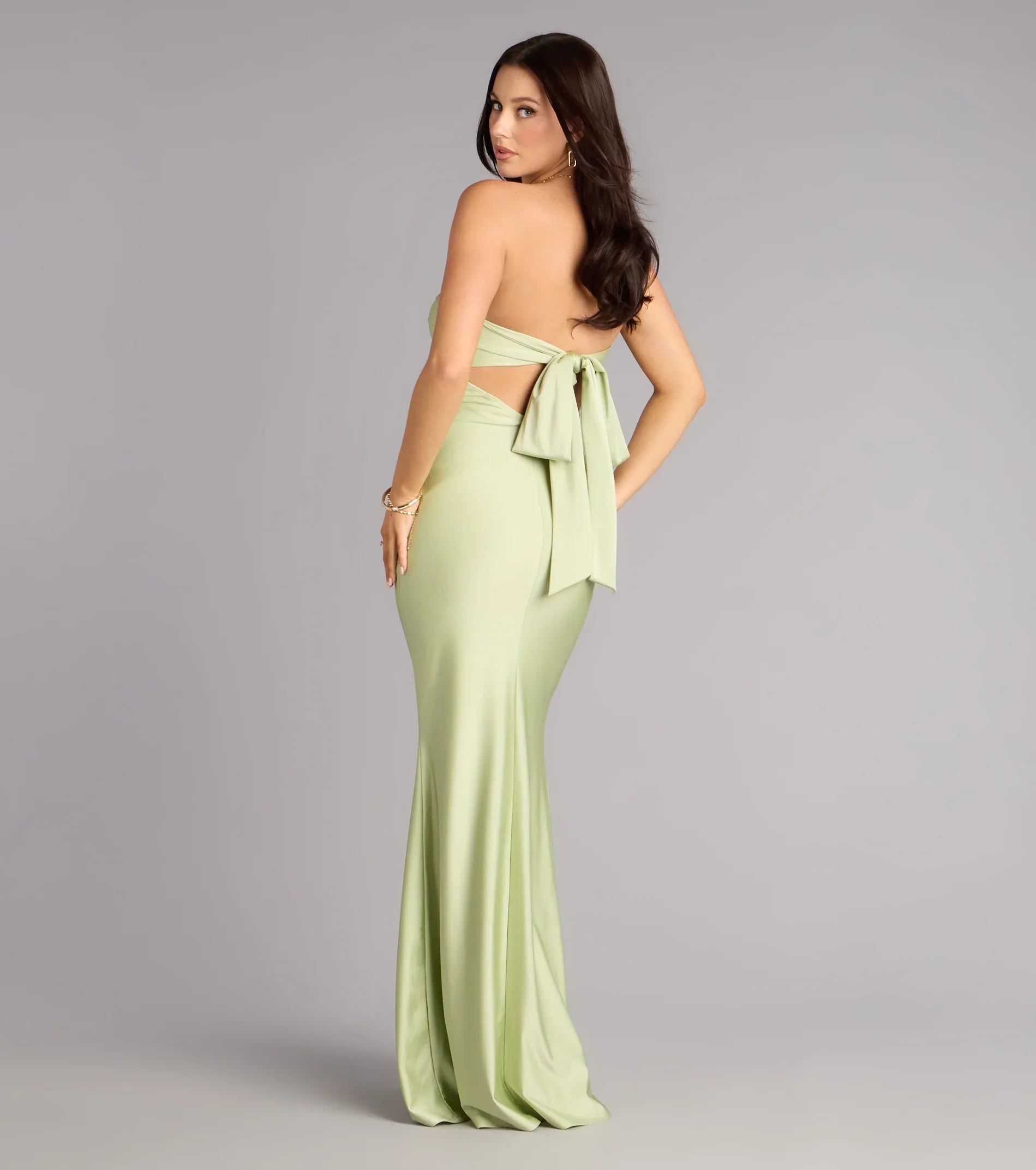 Sleek, chic, and oh-so-flattering, the Kimberly strapless formal dress boasts a trendy tie-back design and mermaid silhouette that accentuates your gorgeous curves!