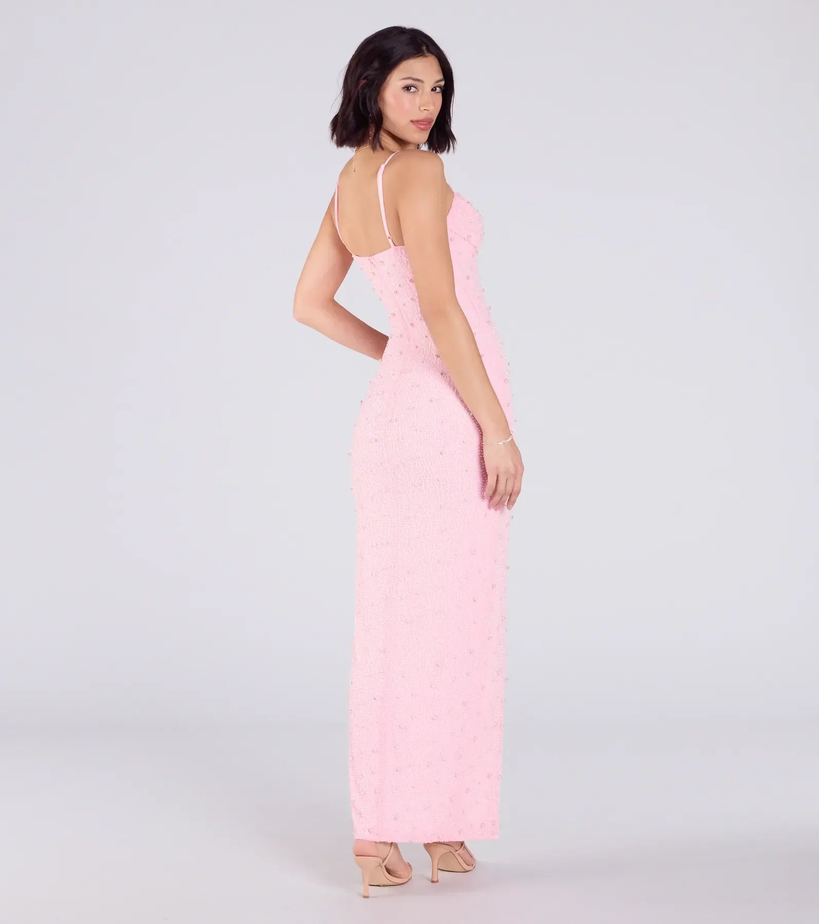 Opulent and stunning! The Klara faux pearl bead formal dress is luxurious for brides, weddings, or black-tie parties. Crafted with meticulous detail, this gown showcases chic faux pearl and beading on mesh fabric to make a statement at any formal event. Her cowl neckline and adjustable straps add a touch of sophistication, while the fitted column silhouette and high front slit create a flattering look while showing off your curves.