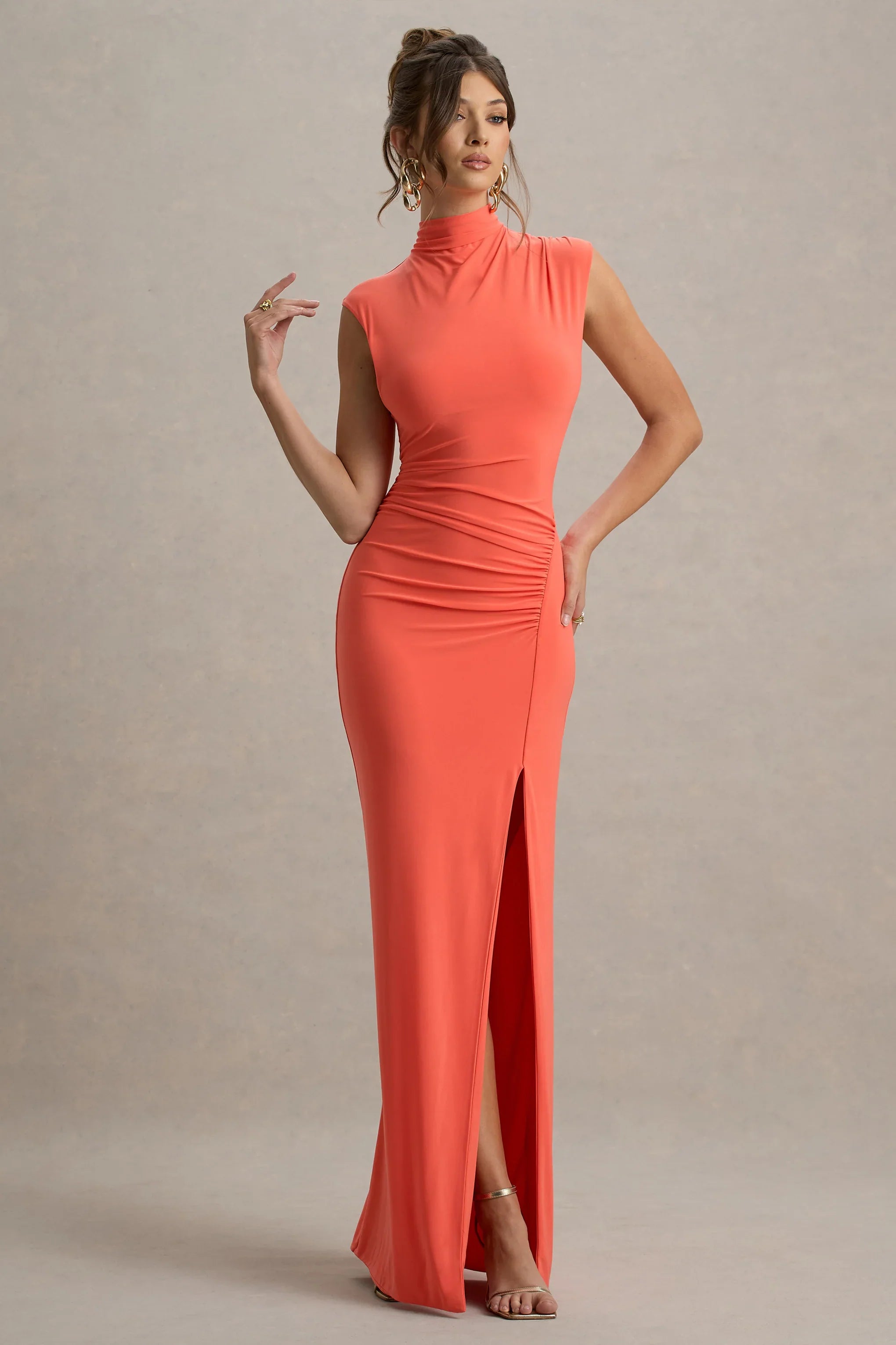As flattering as it is flawless, captivate from all angles in Lanetta. Crafted in a coral shade of our premium jersey known for its stretch properties, this curve-enhancer boasts flattering ruching to cinch your natural silhouette. Further enhancing its charm is a delicately tucked high neckline and sultry leg split that's ensured to turn heads at your next event.