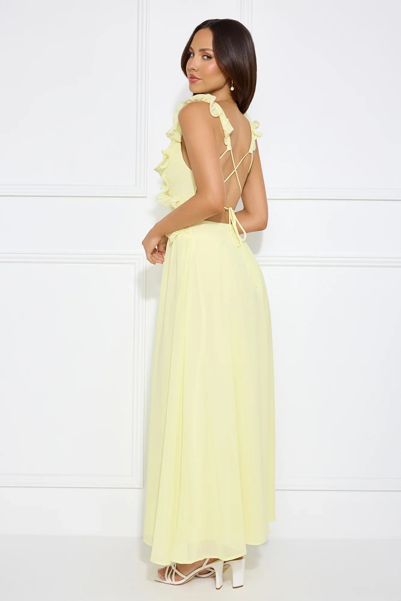 The Light Embrace Maxi Dress features delicate frill details and an open crisscross back for a flirty yet elegant look. Its flowing design adds a touch of softness, making it the perfect choice for a bright, sunny day or evening event. Style with heels.