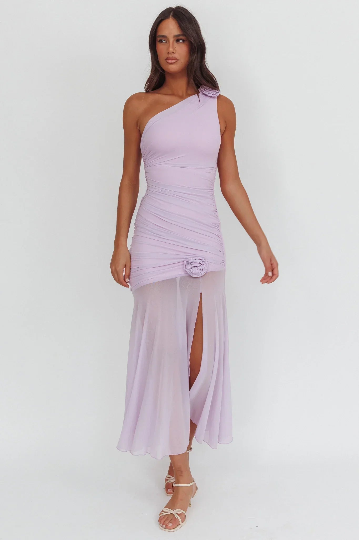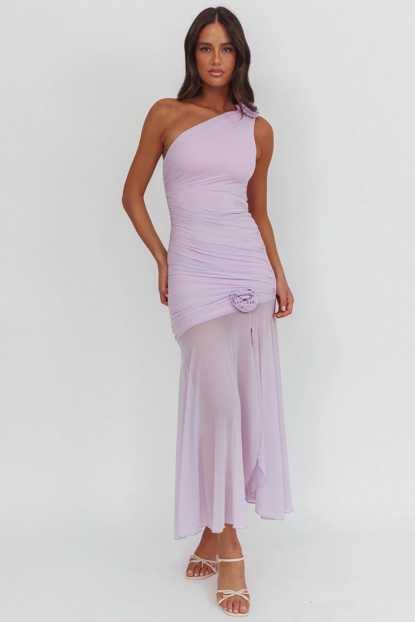 Light up the room in our gorgeous Lost Love maxi dress. It features a sheer hem and one-shoulder design. It's begging to be worn to a wedding or a special event. Team it with nude heels and a clutch for an unforgettable look.