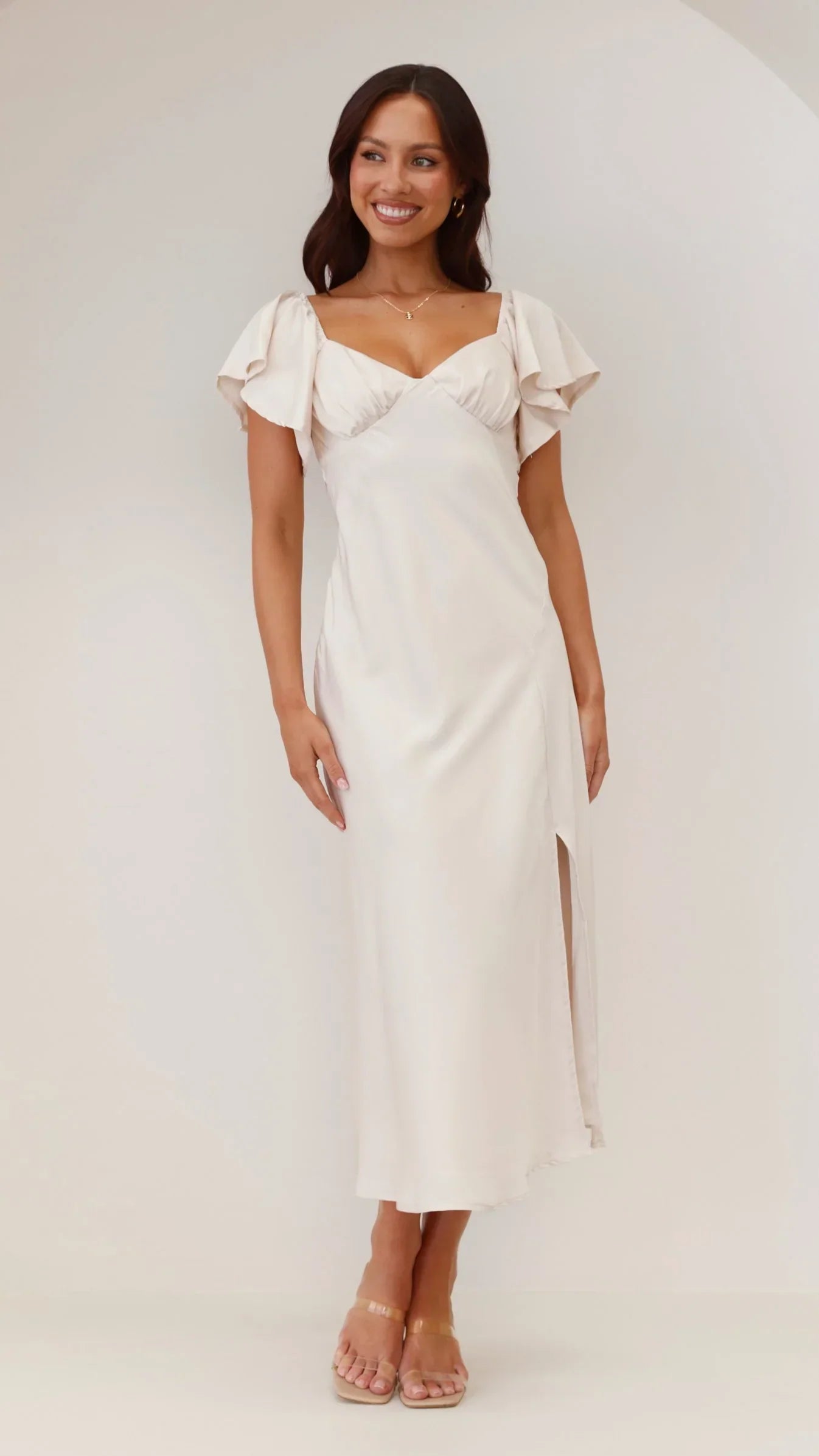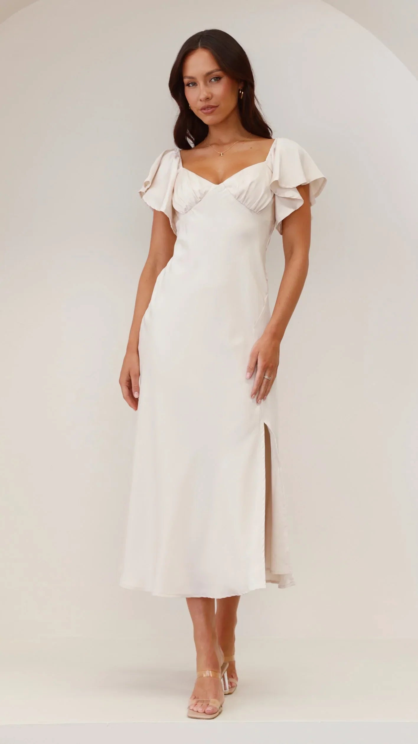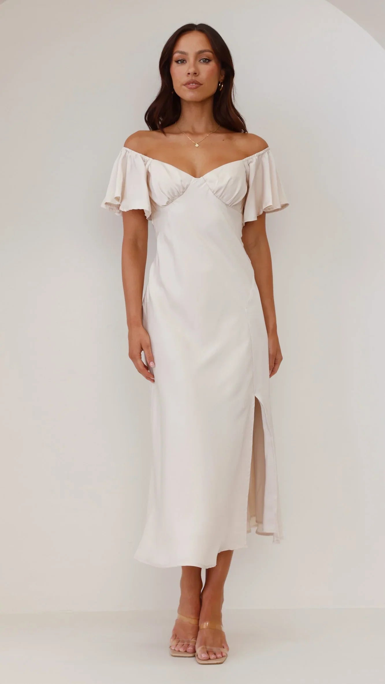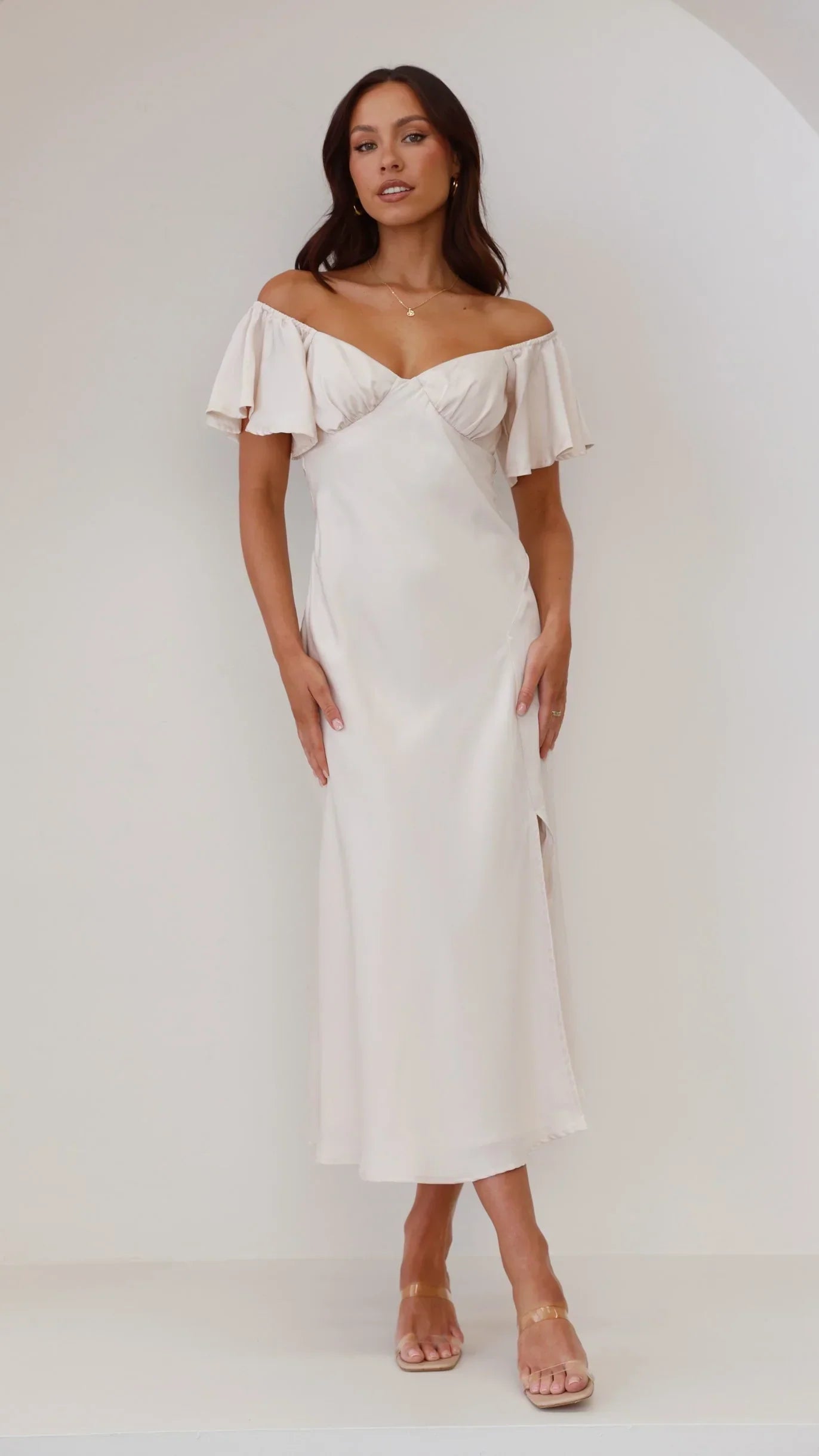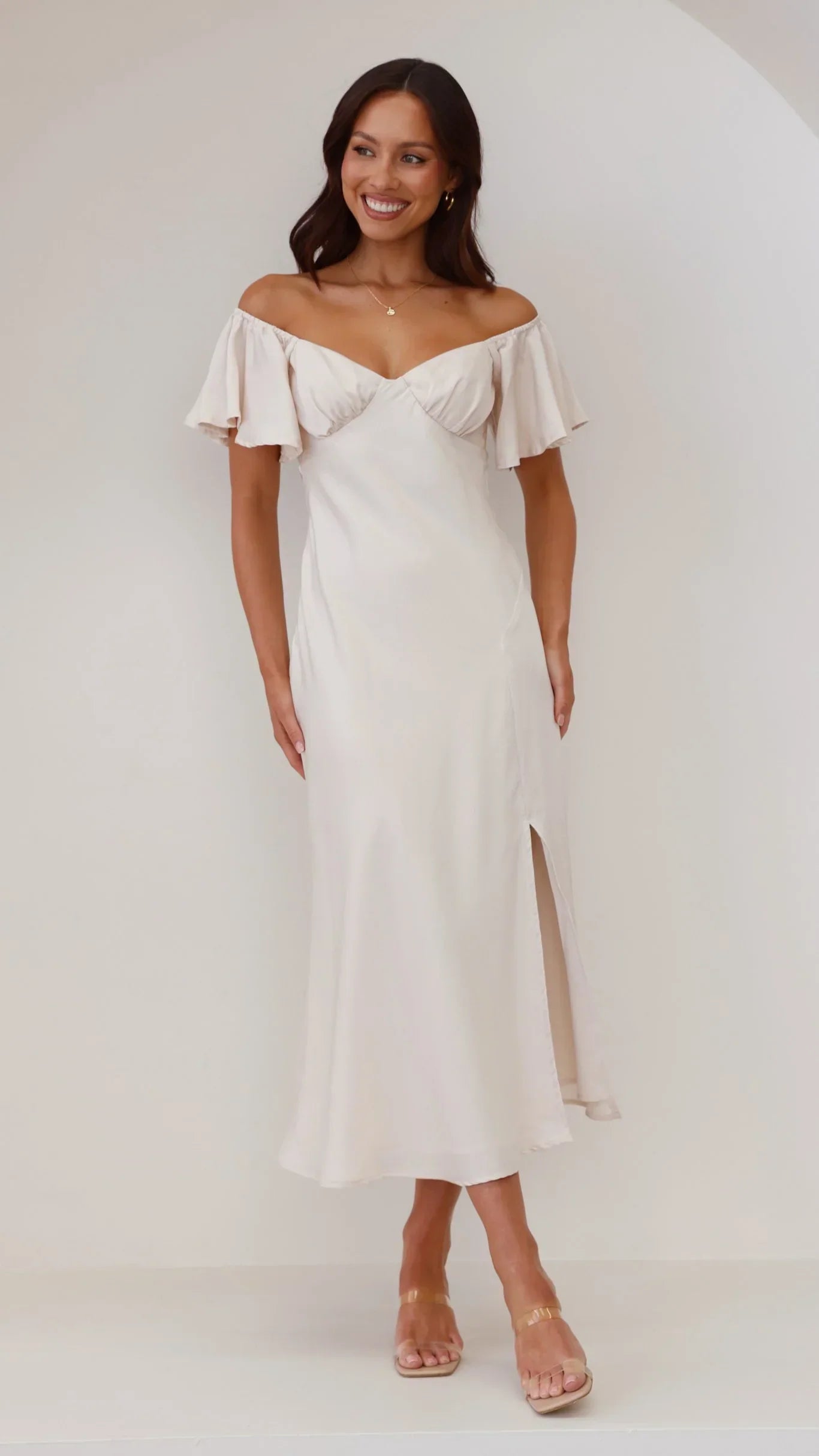 Our Louisa Dress features beautiful butterfly sleeves, flattering off shoulder design, pleated bust and a flirty front slit. This beautiful floaty design takes elegance to the next level - you'll be sure to turn heads in this number. Pair this piece with our and