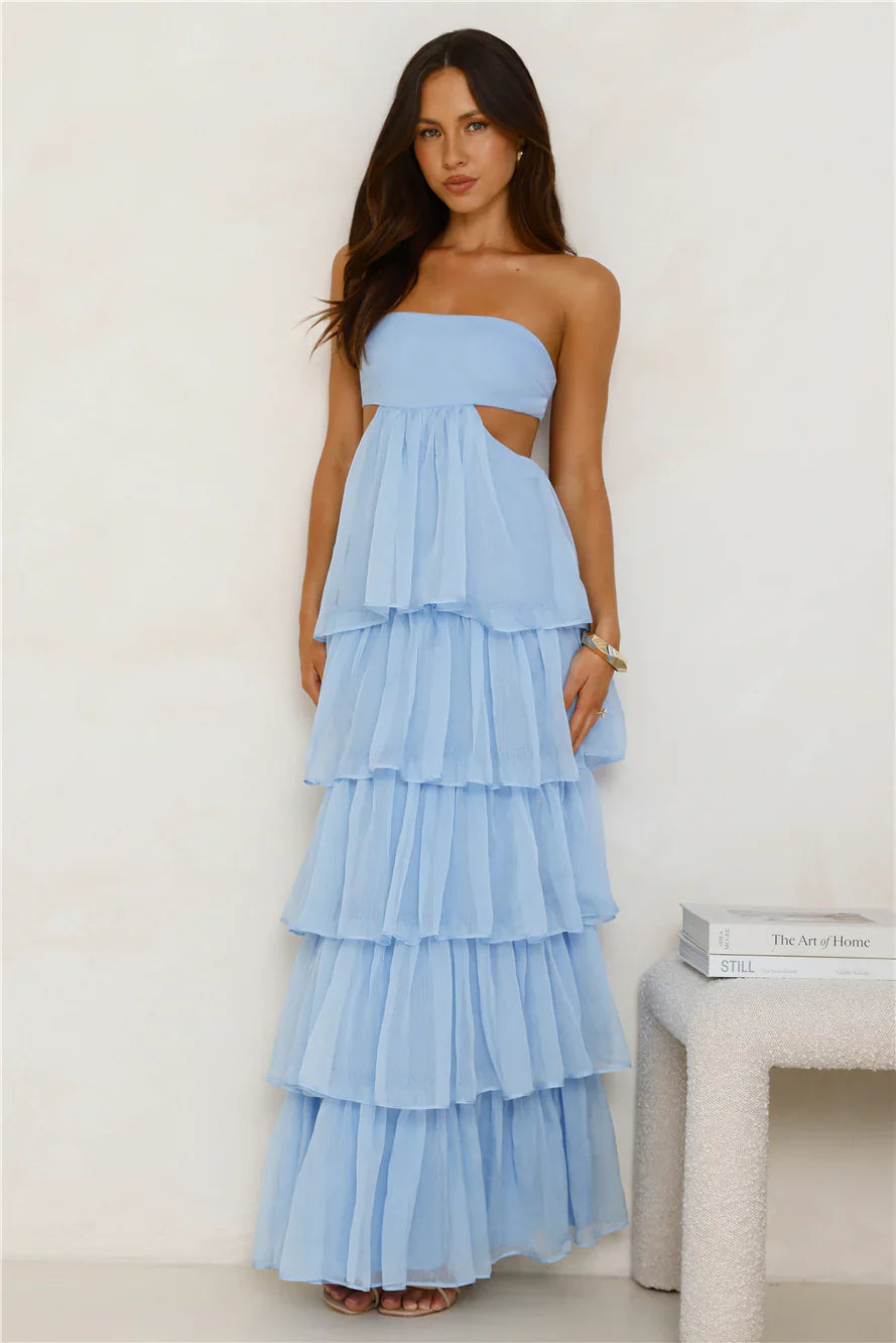 Set the style standards in the Luxe Mode Strapless Maxi Dress. It features an elastic back, a cutout to the waist and a tiered frill skirt. Style with heels and curls.