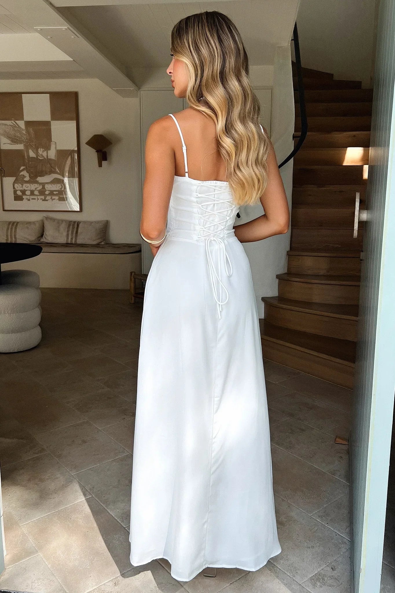 The Magdalena Maxi Dress is the perfect dress for any special event! It features a corset-style top with adjustable straps, a criss-cross tie-up back, and a cute bow detail in the centre. The double-lined material and invisible side zipper provide a comfortable and flattering fit. Complete the look with simple heels and gold jewellery!