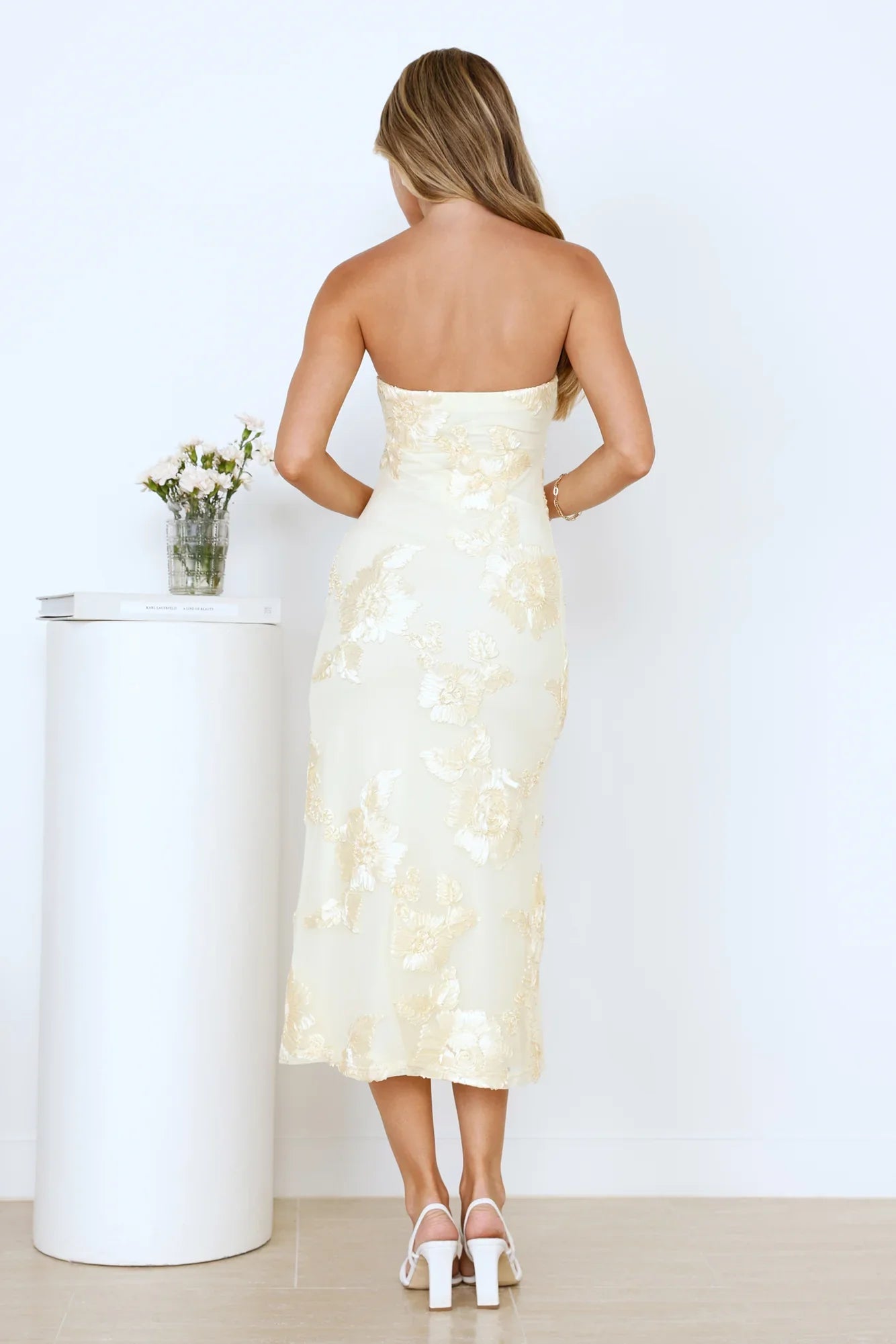 A look we're in absolute love with. The Magic Haze Strapless Mesh Midi Dress features a strapless design, embroidered details and an elastic neckline. Style with heels and curls.