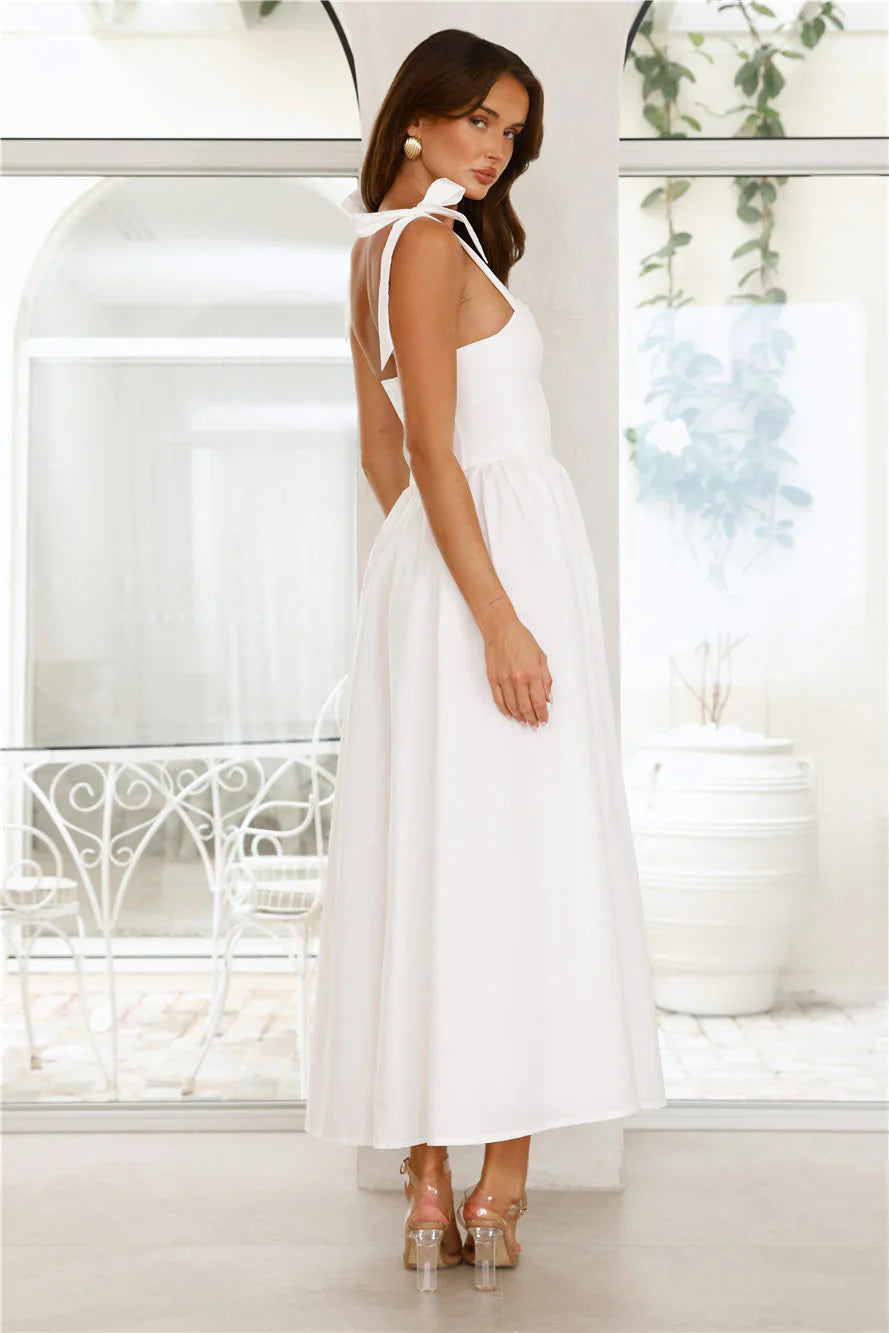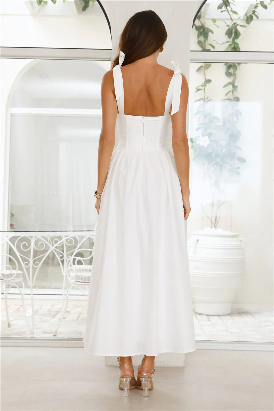 The Magical Dream Maxi Dress is the epitome of elegance, featuring delicate tie-up shoulder straps, a structured boned bodice, and a dreamy flowy skirt that creates an effortlessly romantic silhouette. Style with sandals.