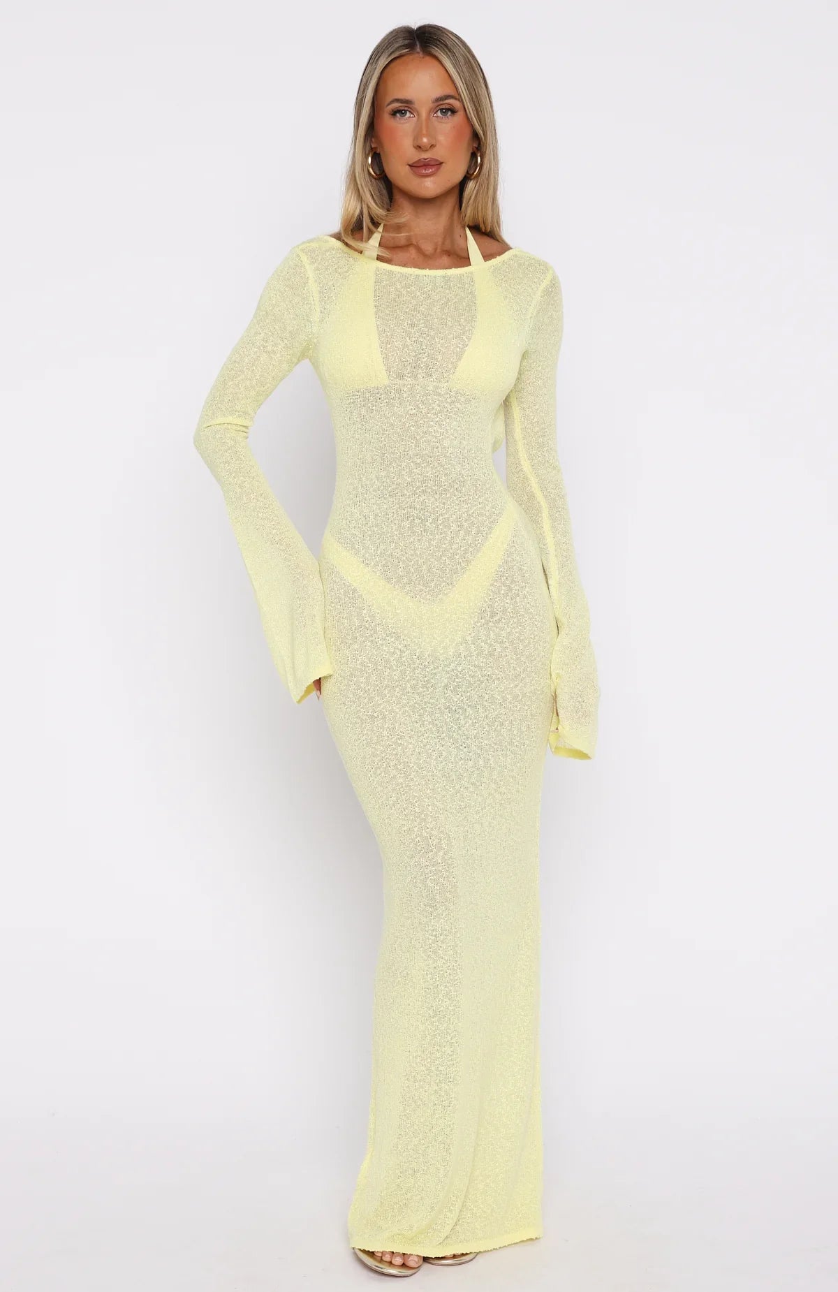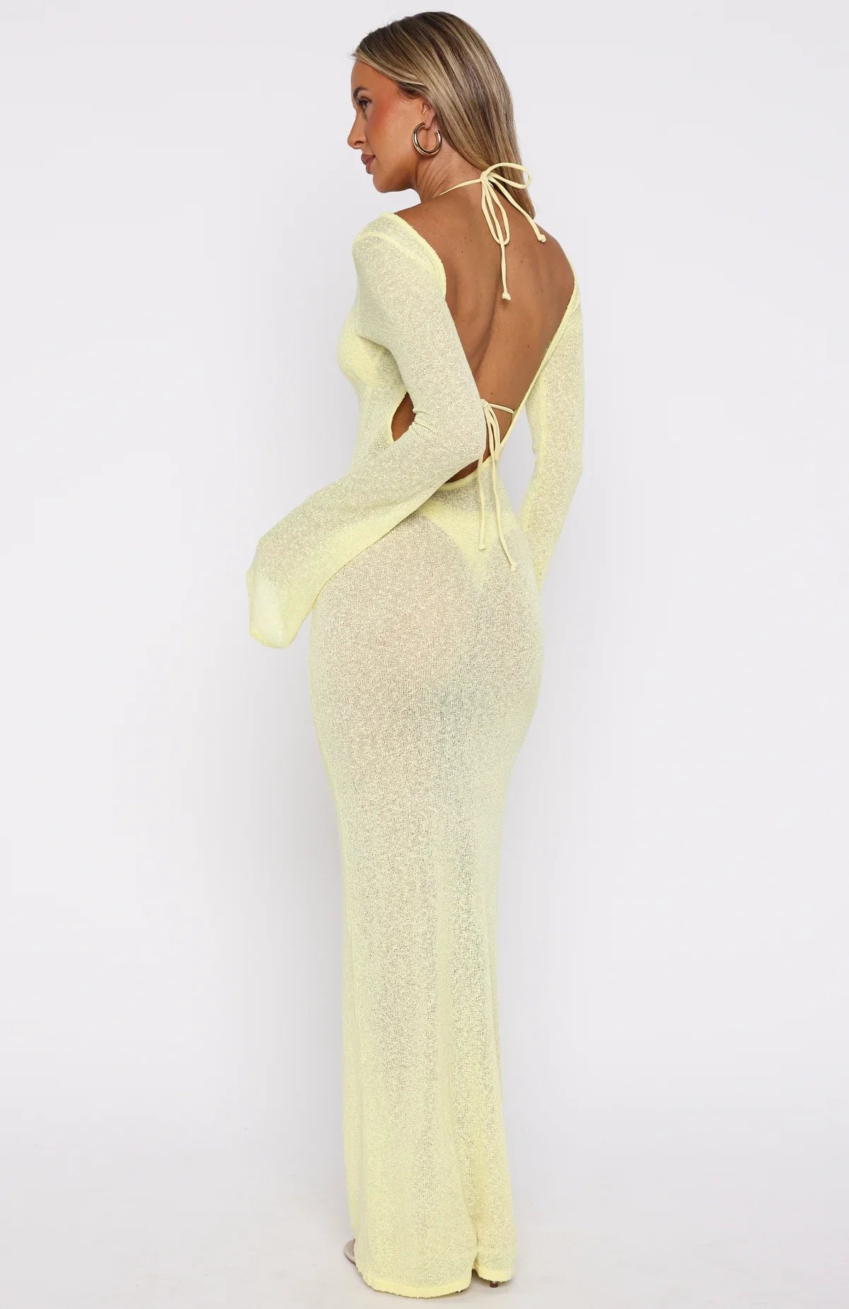 The Malta Mermaids Long Sleeve Maxi Dress in Lemon is here to make you glow! Slip into effortless chic with this slightly sheer, stretch-knit maxi featuring long sleeves, high neckline, and daring open back for a sultry, slip-on poolside look. Toss it over a matching bikini and you’re instantly beach-ready.
