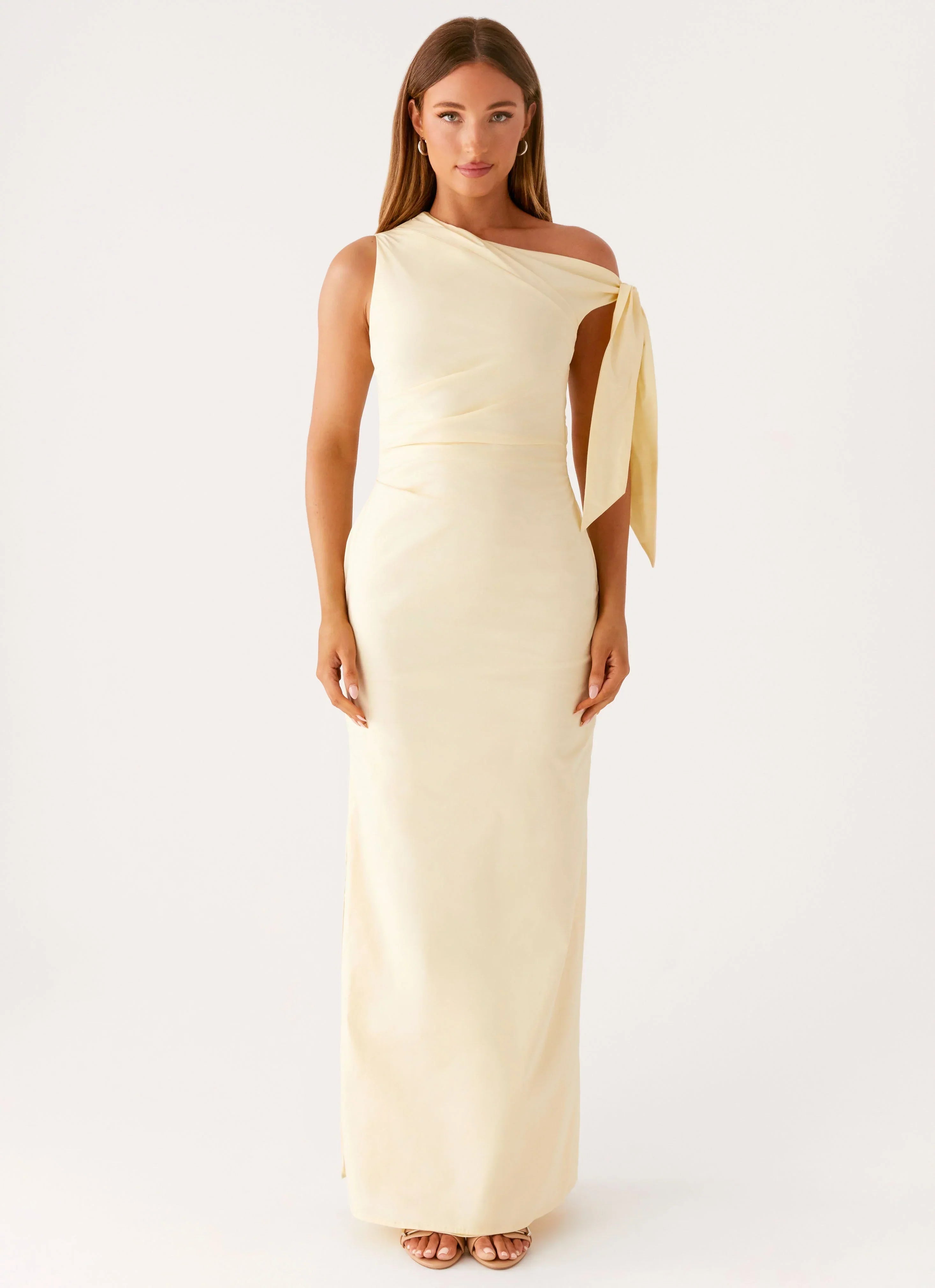 The Marella Maxi Dress is made for sunlit nights and effortless style. Featuring an asymmetrical neckline with side shoulder tie and ruched sides, this fully lined maxi dress is finished with a side hook and eye and invisible zipper for a seamless fit.