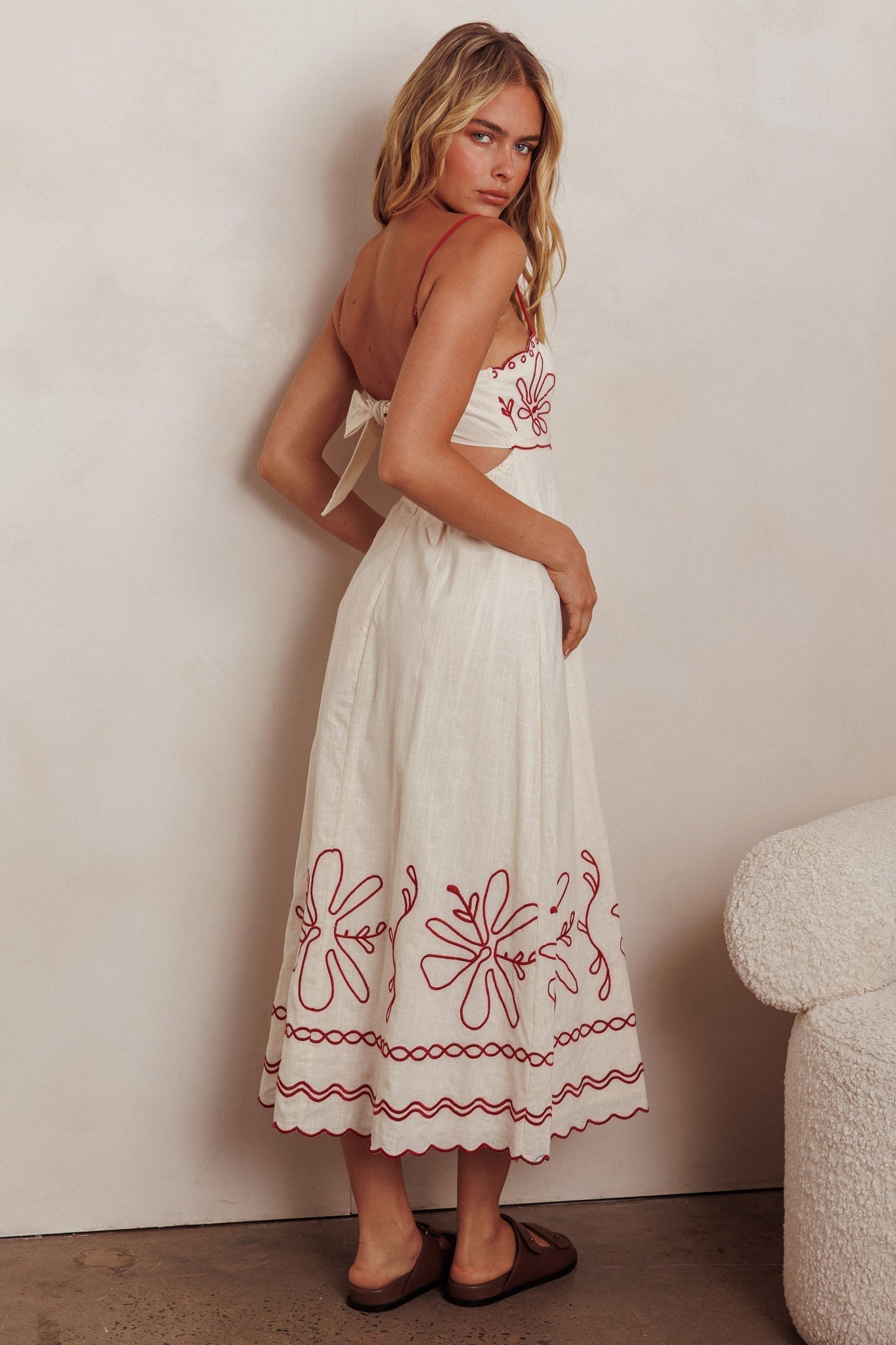 Hello, sunshine! We've fallen head over heels for our adorable Mondo maxi dress. It features the sweetest embroidery detail and a tie closure in the back. Wear it on weekends for coffee with your girls, teamed with a tote and sandals for a chic look.