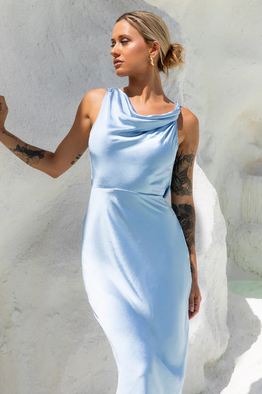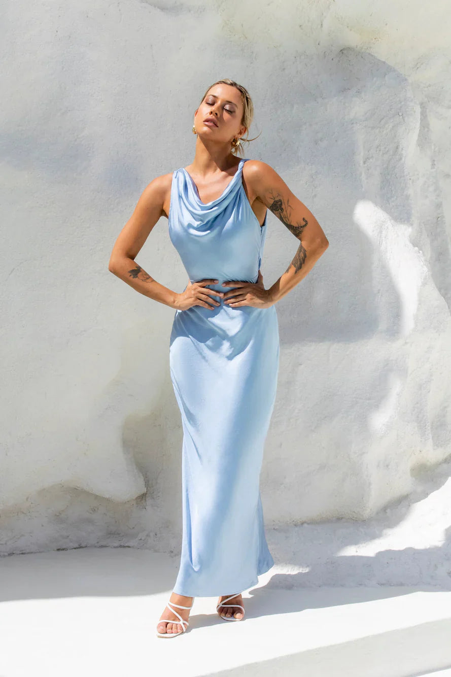 Designed for fancy events, the Moonlit Palms Satin Maxi Dress is the perfect silhouette. Featuring a gorgeous silky satin design, a cowl neckline and a back tie. Style with heels for all the attention!