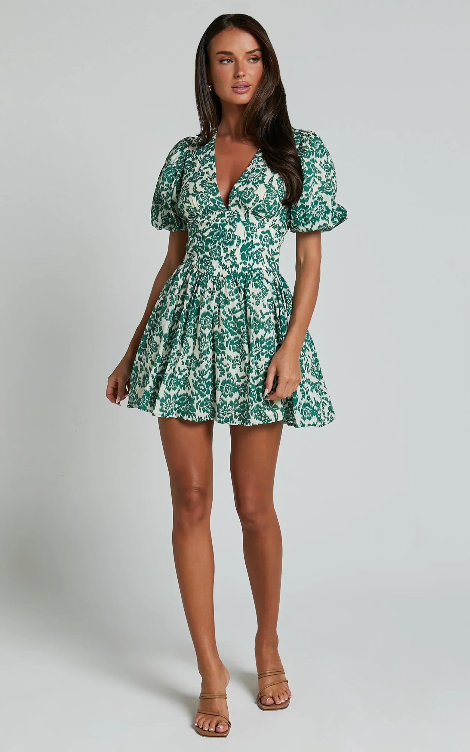 Stand out from the crowd in our Nelli Mini Dress - a vibrant green silhouette that is as unique and empowering as you are. This playful fit & flare dress features short puff sleeves and a flattering plunge neckline, perfect for any party day or night. Made with soft voile polyester fabric, this dress also offers a shirred back detail for added comfort and style. Get ready to turn heads and make a statement in this must-have mini dress!