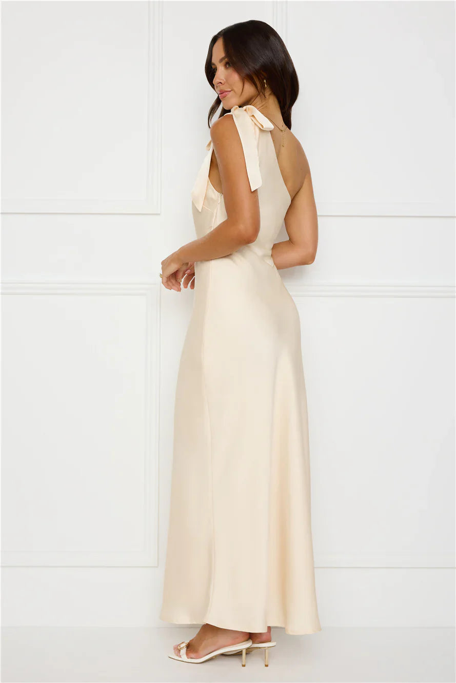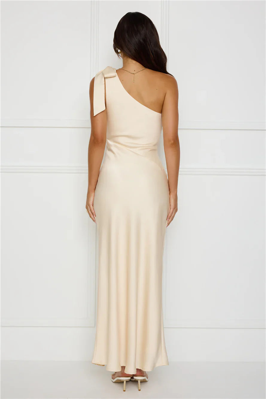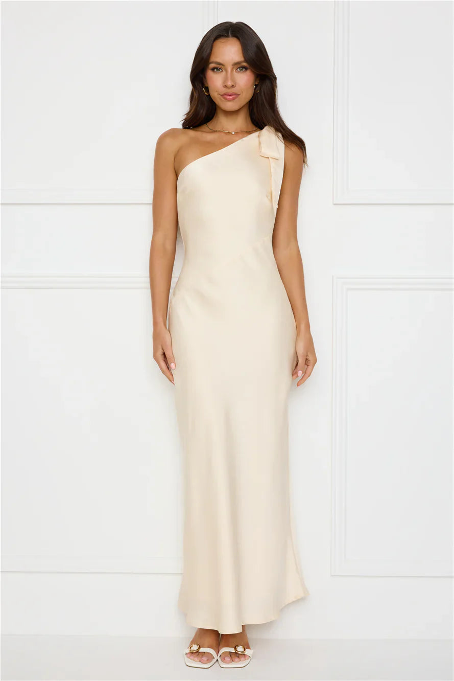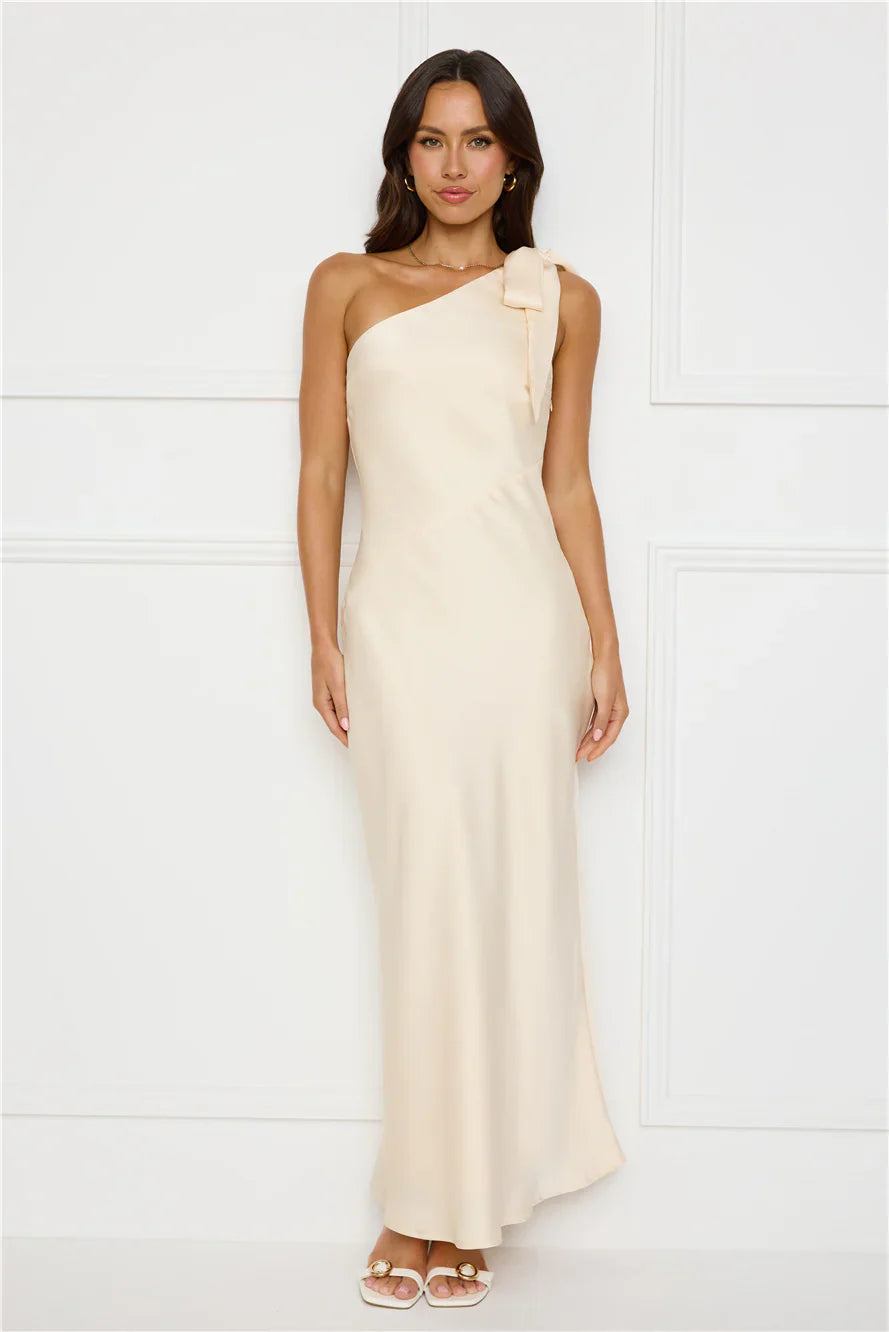 The Night of Distinction One Shoulder Satin Maxi Dress is the epitome of elegance, featuring a one-shoulder tie design, satin fabric that drapes beautifully, and a straight, flowy skirt that moves gracefully with every step. Perfect for an evening of sophistication and style. Pair with heels and sparkly accessories.