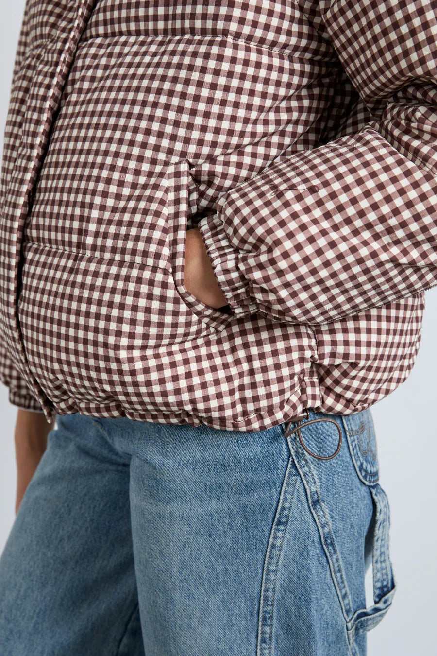 Prepare for autumn with our Jennifer check puffer. featuring removable sleeves and made using recycled polyester.