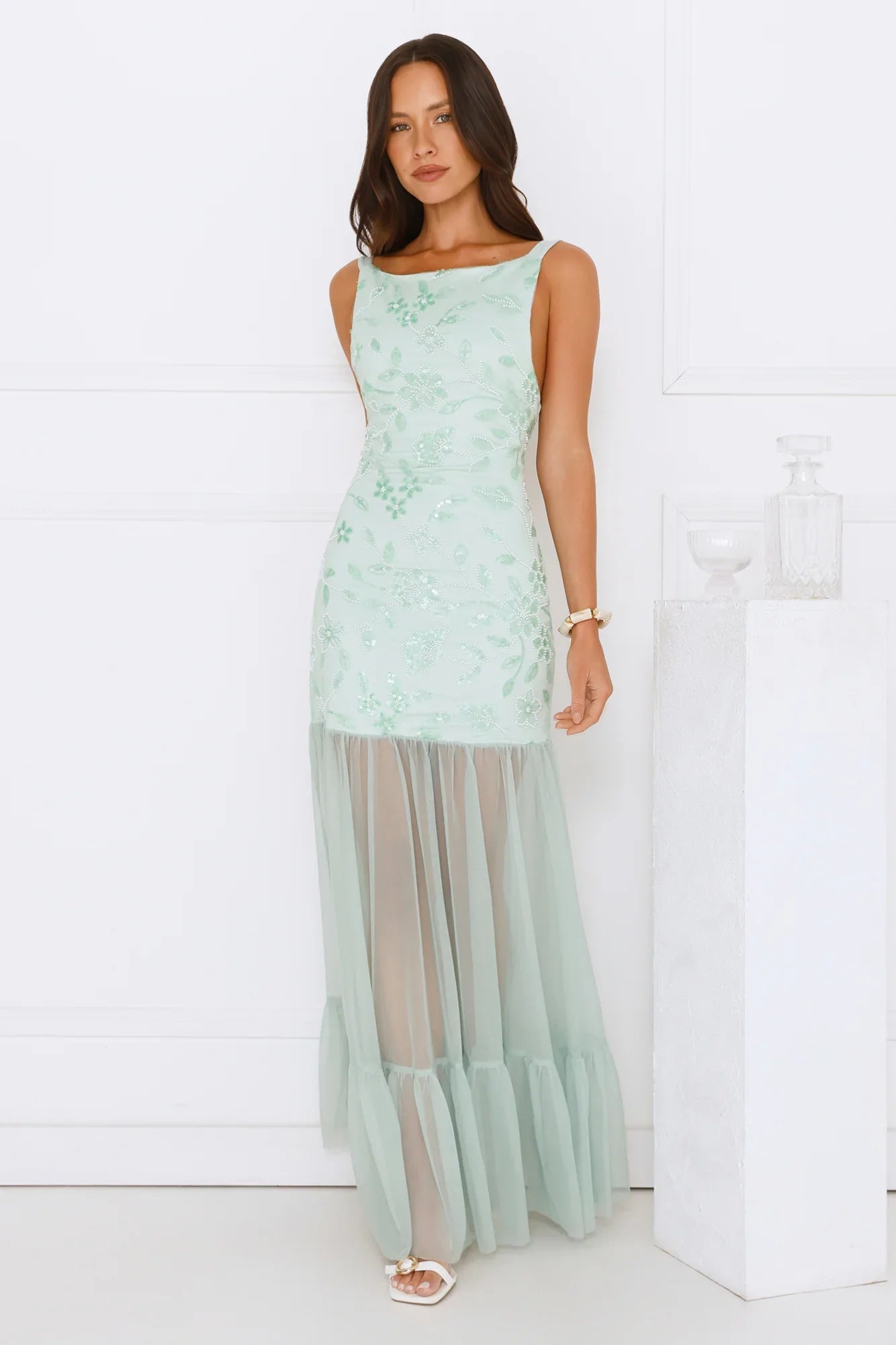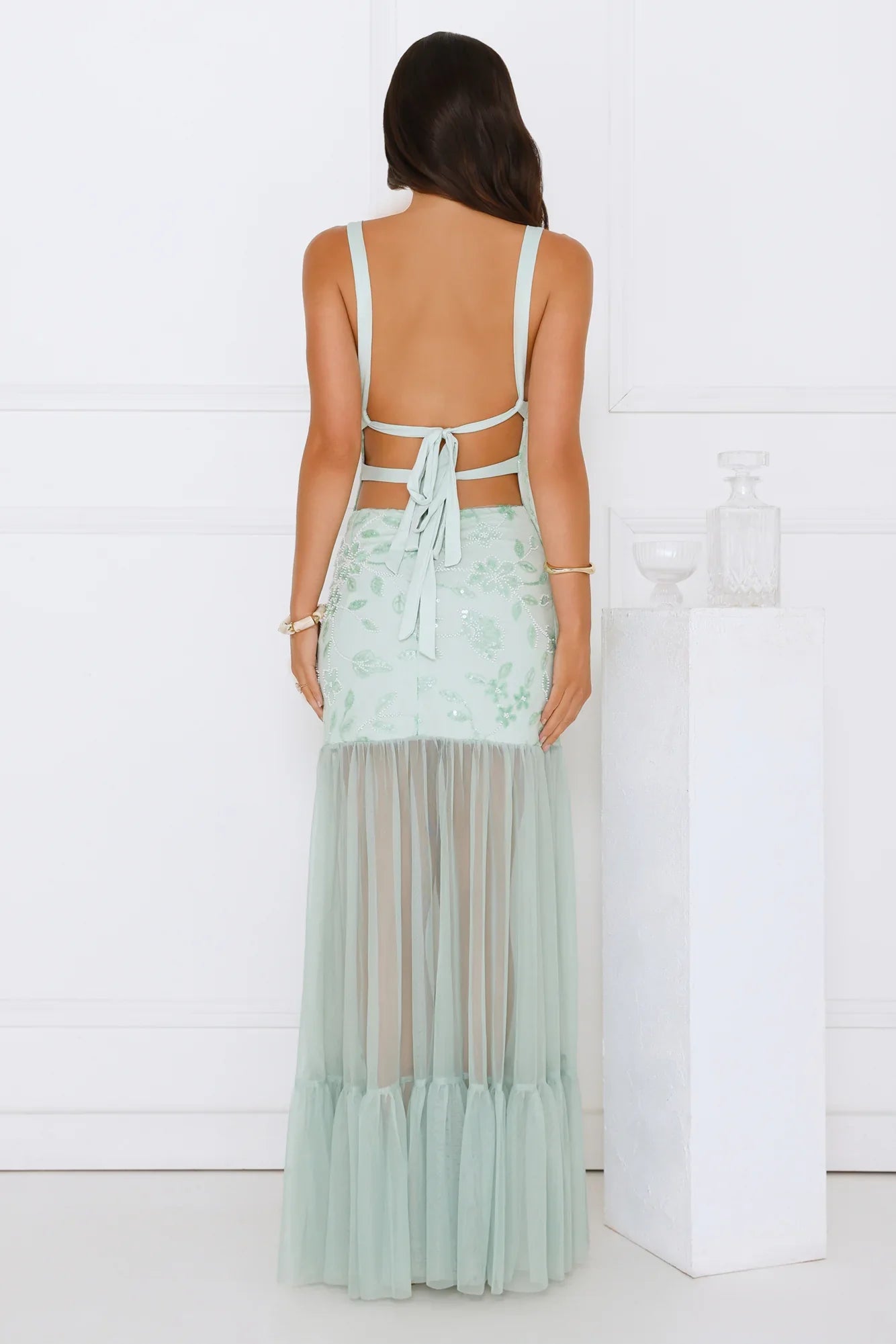 Dress to impress in the Pretty Girl Phase Mesh Maxi Dress. Featuring a gorgeous sequin and beaded design, a sheer mesh skirt and a tie-up back that'll have the spotlight on you! Style with heels and curls for a 'fit that'll crown you best-dressed!