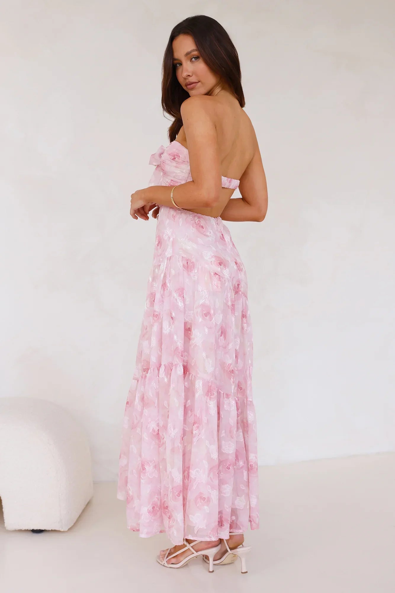 Be seen in a gorgeous dress. The Queen Scenes Strapless Maxi Dress features a tie to the neckline, a flowy skirt and a dreamy textured print. Style with heels for a 'fit you'll want pics' in!